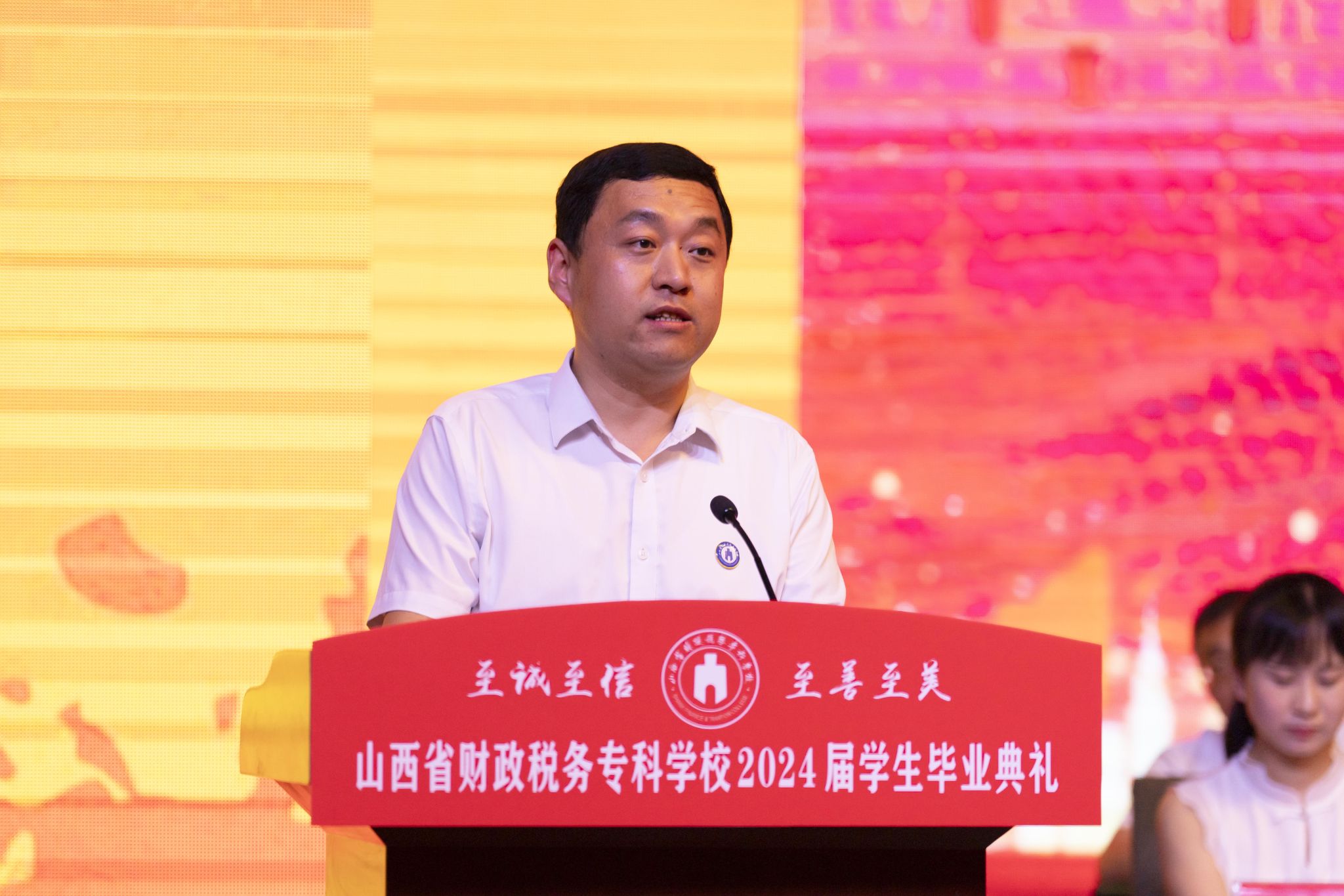 随后,李赟鹏做了毕业致辞,他代表学校向圆满完成学业的毕业生表示热烈的祝贺,向辛勤付出的老师、家长,以及关心支持他们成长成才的学校员工、校友、各级领导、各界朋友表示衷心的感谢和崇高的敬意。他寄语全体毕业生,一是让自己的钱包鼓起来。希望同学们通过自身努力,勇挑时代重任,在真刀真枪的实干中成就一番事业,同时怀有“穷则独善其身,达则兼济天下”的胸怀,努力在实现自我价值中更好地回报社会。二是让自己的身体棒起来。希望同学们坚持体育锻炼,培养良好的生活方式,以强健的体魄和昂扬的姿态书写美好人生新篇章。三是让自己的心灵悦起来。希望同学们尊重自我,学会捕捉美好,懂得欣赏自己,与人为善、与事为善,从善良的心出发,善于处理不和谐之事,以愉悦的心情去感受人生。四是让自己的家庭暖起来。希望同学们能够珍惜家庭时光,勇敢成为家庭支柱,为父母分忧解难,为孩子树立榜样,为爱人带来温暖,同时厚植家国情怀,将“小家小爱”化作“家国大爱”。五是让自己的人生顺起来。希望同学们坚守正确方向,学会自我调节、自我鼓励、自我成就,做一个情绪稳定,冷静睿智,具有强大内心的人。