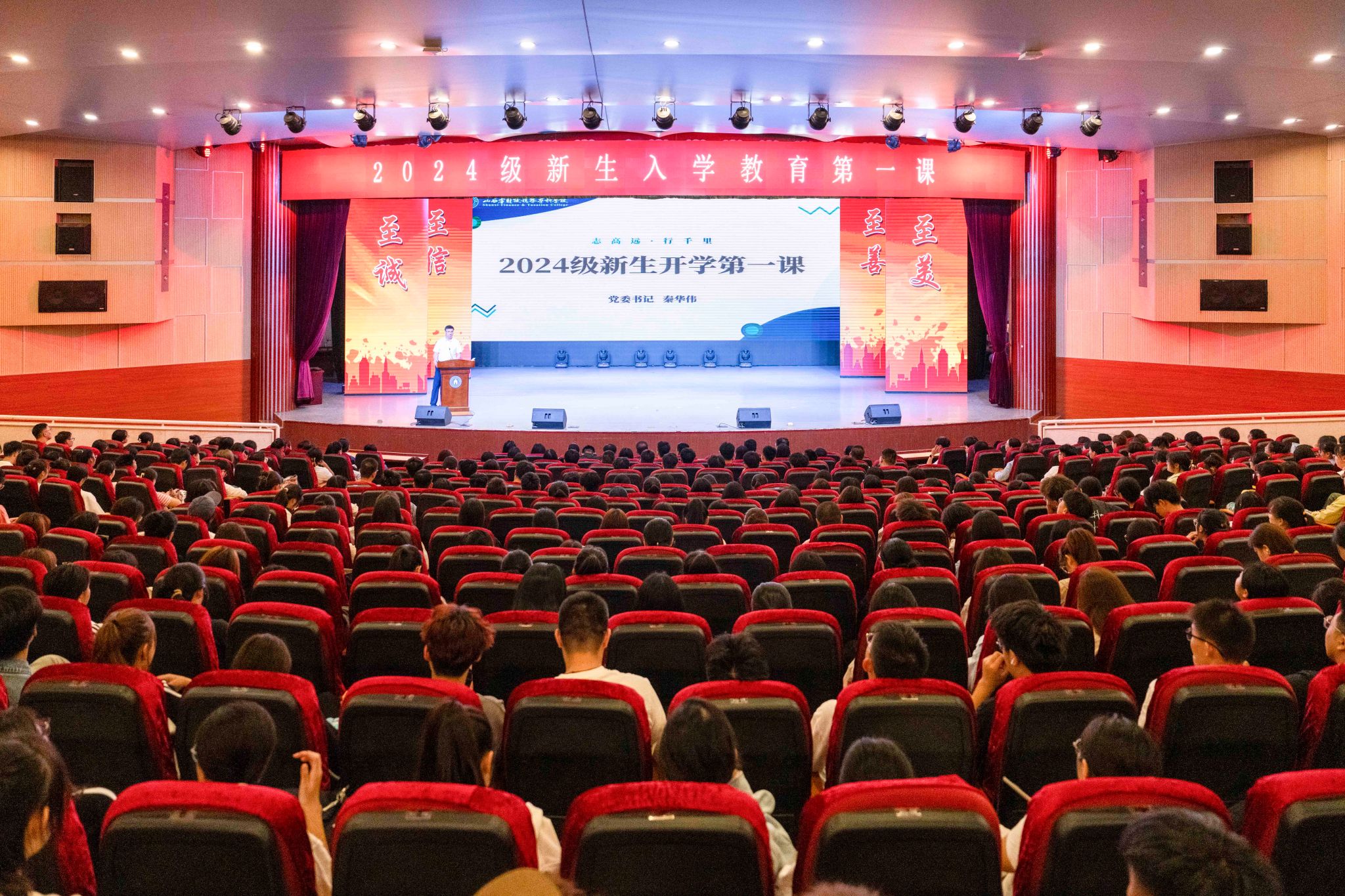 9月11日上午,校党委书记秦华伟以“把握时代机遇 迎接人生挑战 争做堪当民族复兴重任的时代新人”为题,为财税学院、信息科技学院、大数据学院2024级新生讲授“开学第一课”,学校办公室、学生工作部、相关学院负责人、新生班辅导员以及900余名师生在南院会堂共同聆听。