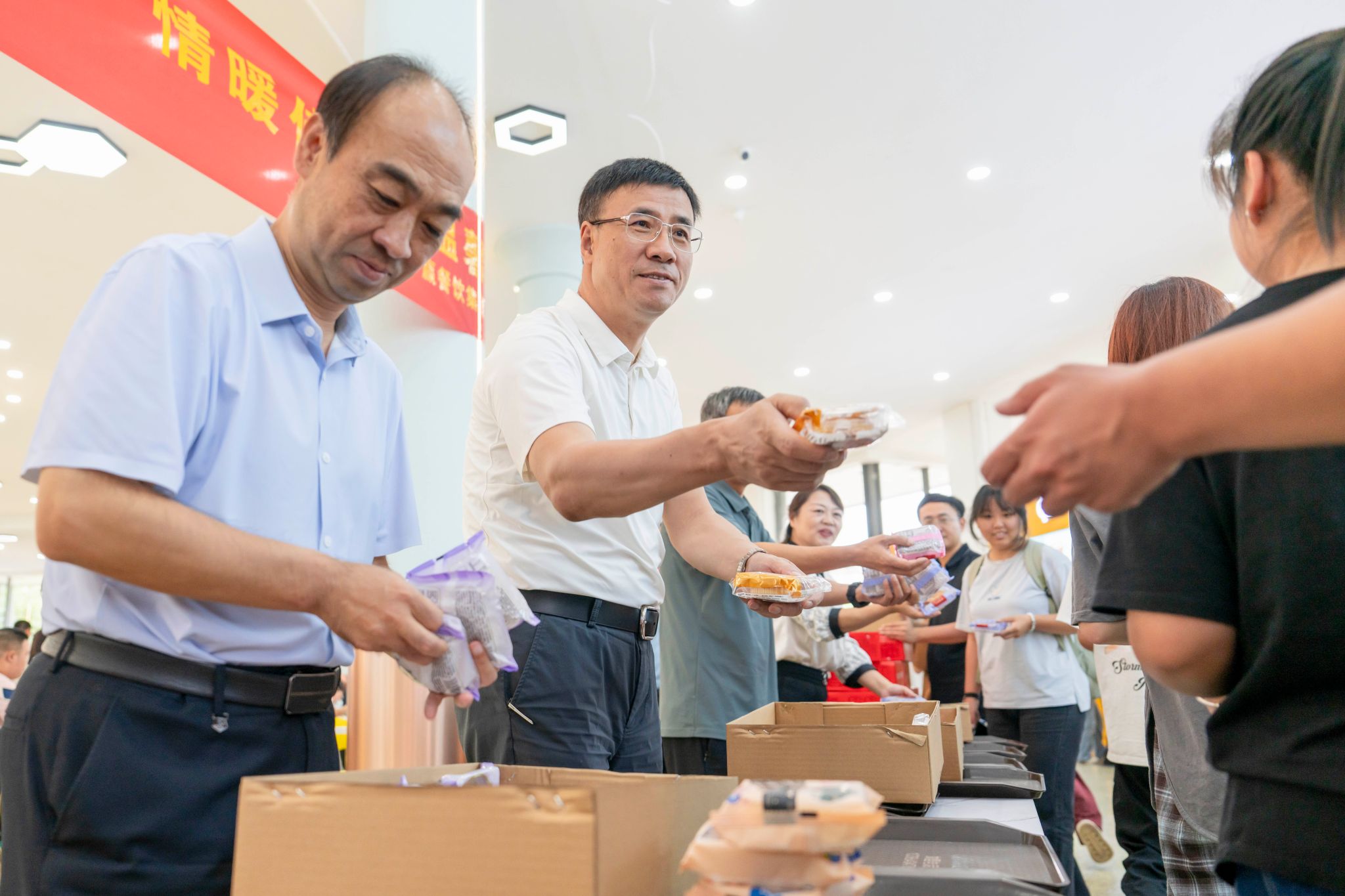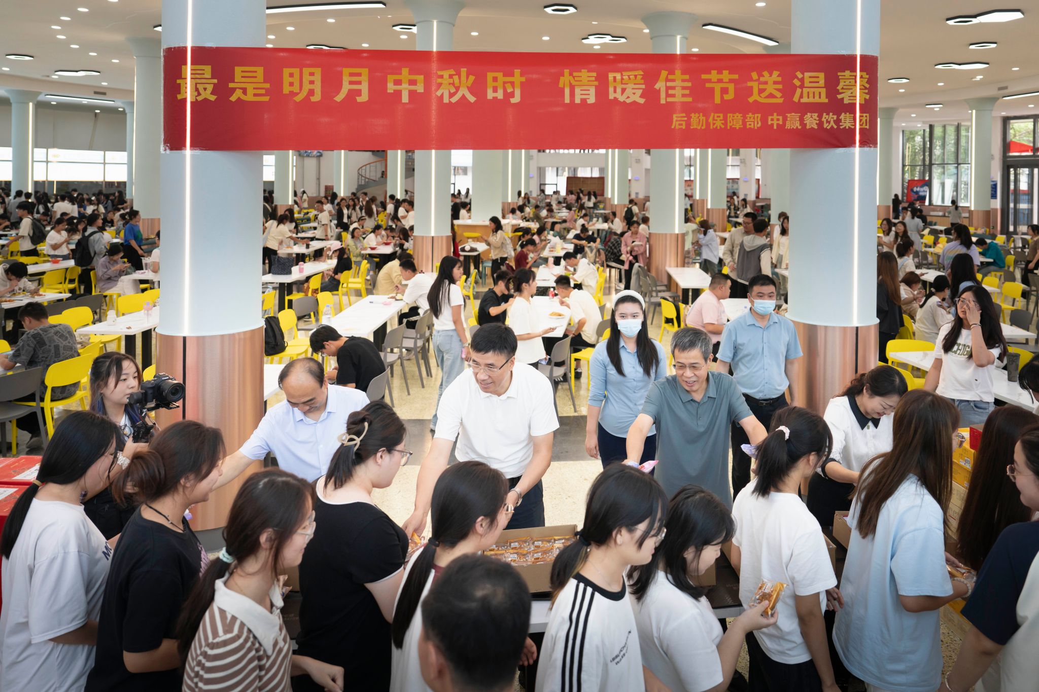 党委书记秦华伟带领班子成员来到学生餐厅,与工作人员一起给学生分发月饼,并与学生进行亲切交谈。他勉励同学们要珍惜大学校园时光,勤奋学习,在脚踏实地的奋斗中创造属于自己的精彩人生。