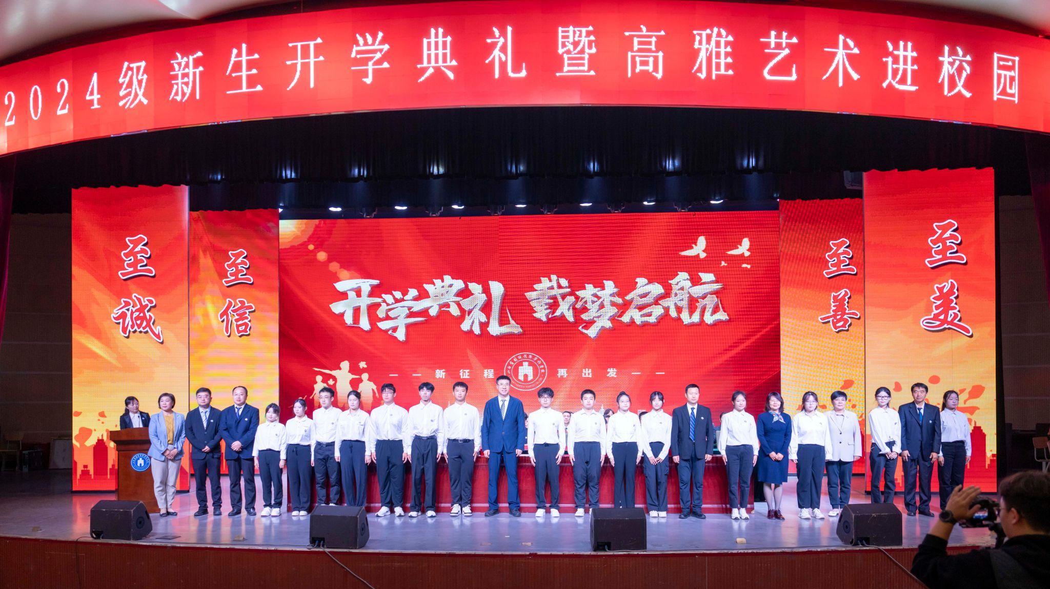 李赟鹏带领全体新生诵读校训,“至诚至信,做忠诚担当诚实守信之人;至善至美,做精益求精守正创新之事”。他勉励同学们传承学校精神文化,领悟做人做事真谛。