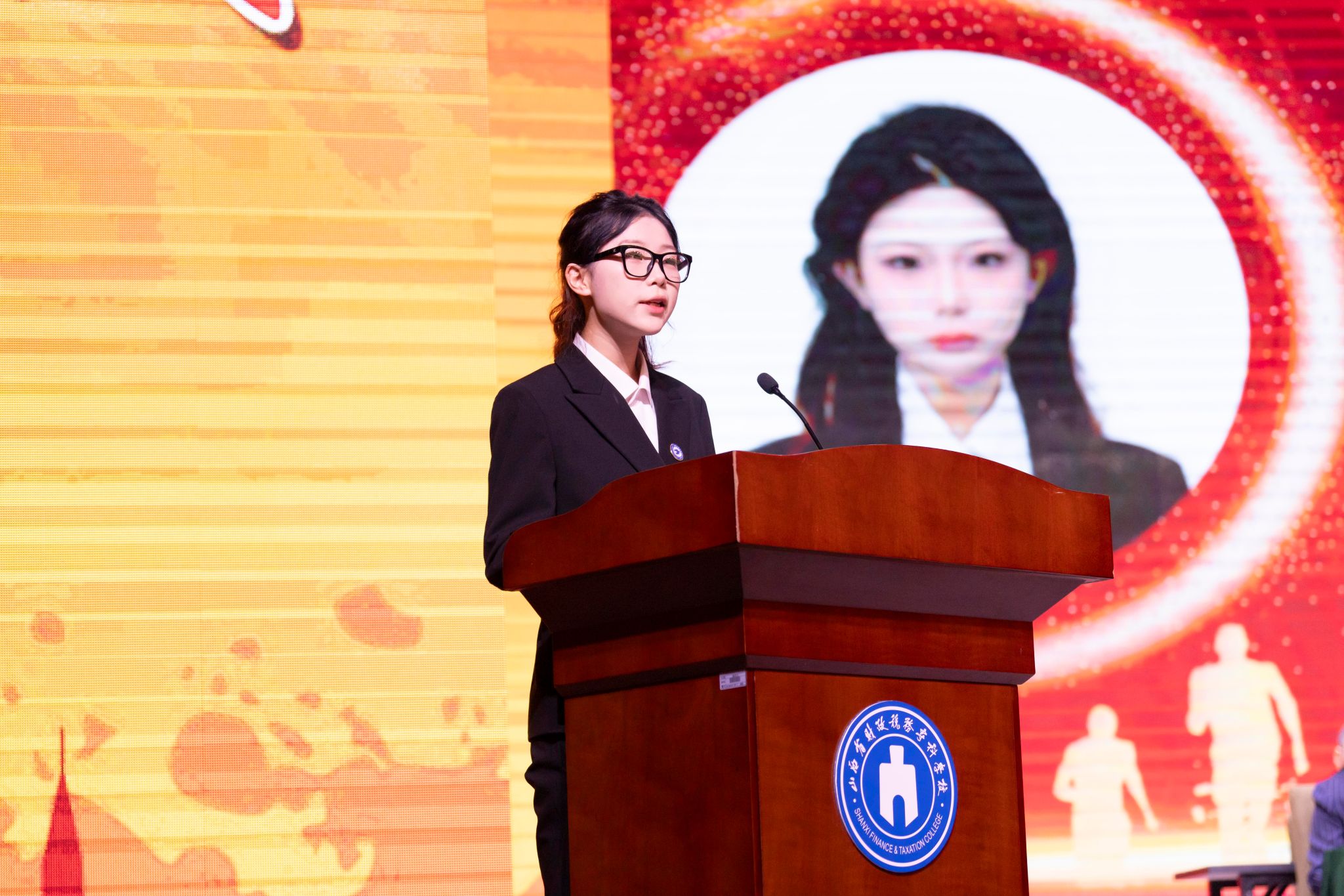 典礼上,党委书记秦华伟和各学院党总支书记为2024级新生代表佩戴校徽。一枚“财专”校徽,代表着“财专人”身份,承载着财专的使命与荣光,更传递着财专人的使命与担当。
