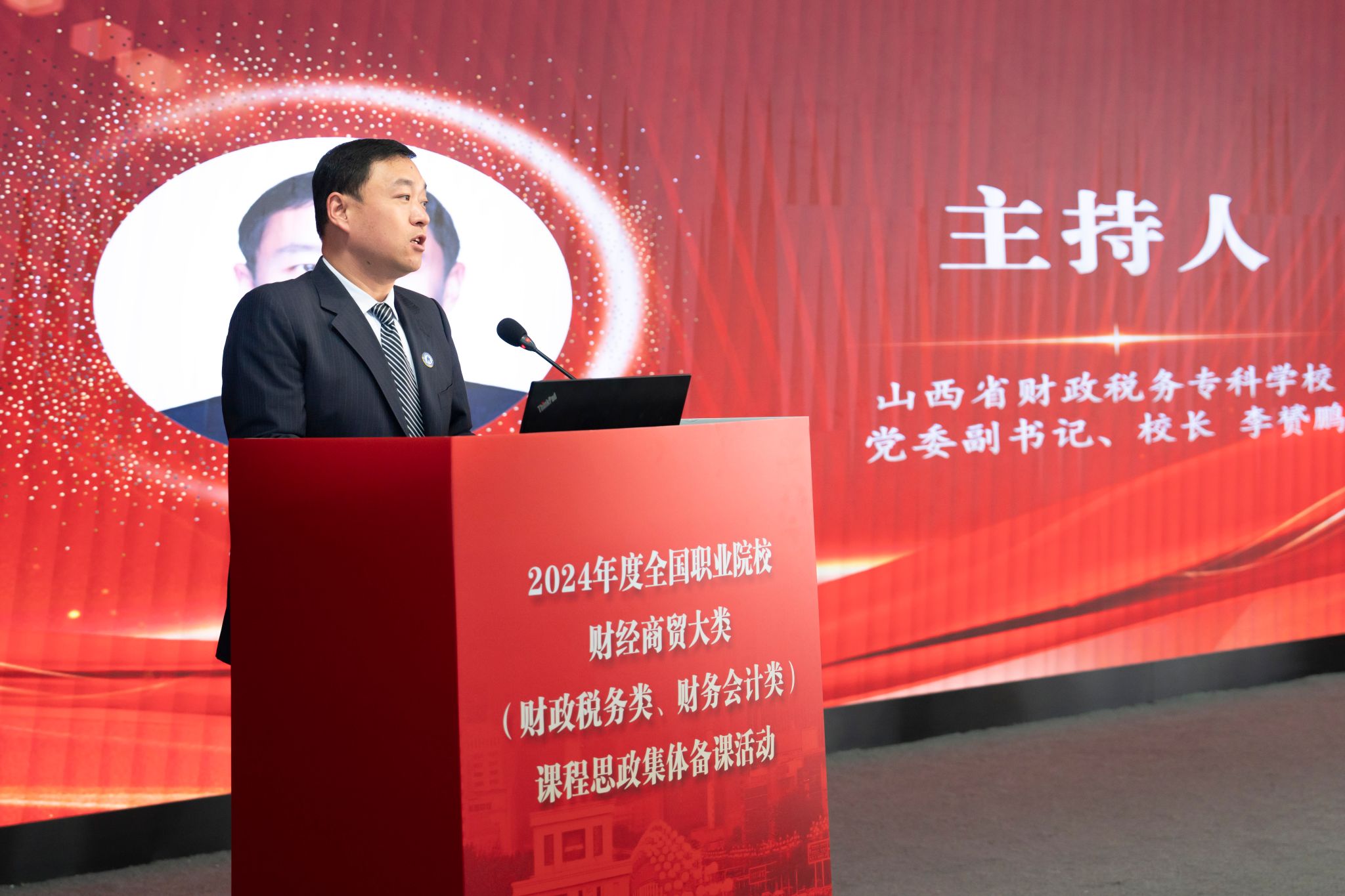 10月23日,2024年度全国职业院校财经商贸大类(财政税务、财务会计类)课程思政集体备课活动在bat365举办。本次活动由教育部职业教育与成人教育司指导,全国财政职业教育教学指导委员会主办,bat365正版唯一官网承办,高等教育出版社、国家数智财经行业产教融合共同体协办。本次活动采取线上+线下的方式,通过国家职业教育智慧教育平台、“智慧职教”平台进行直播。校党委副书记、校长李赟鹏主持开幕式。