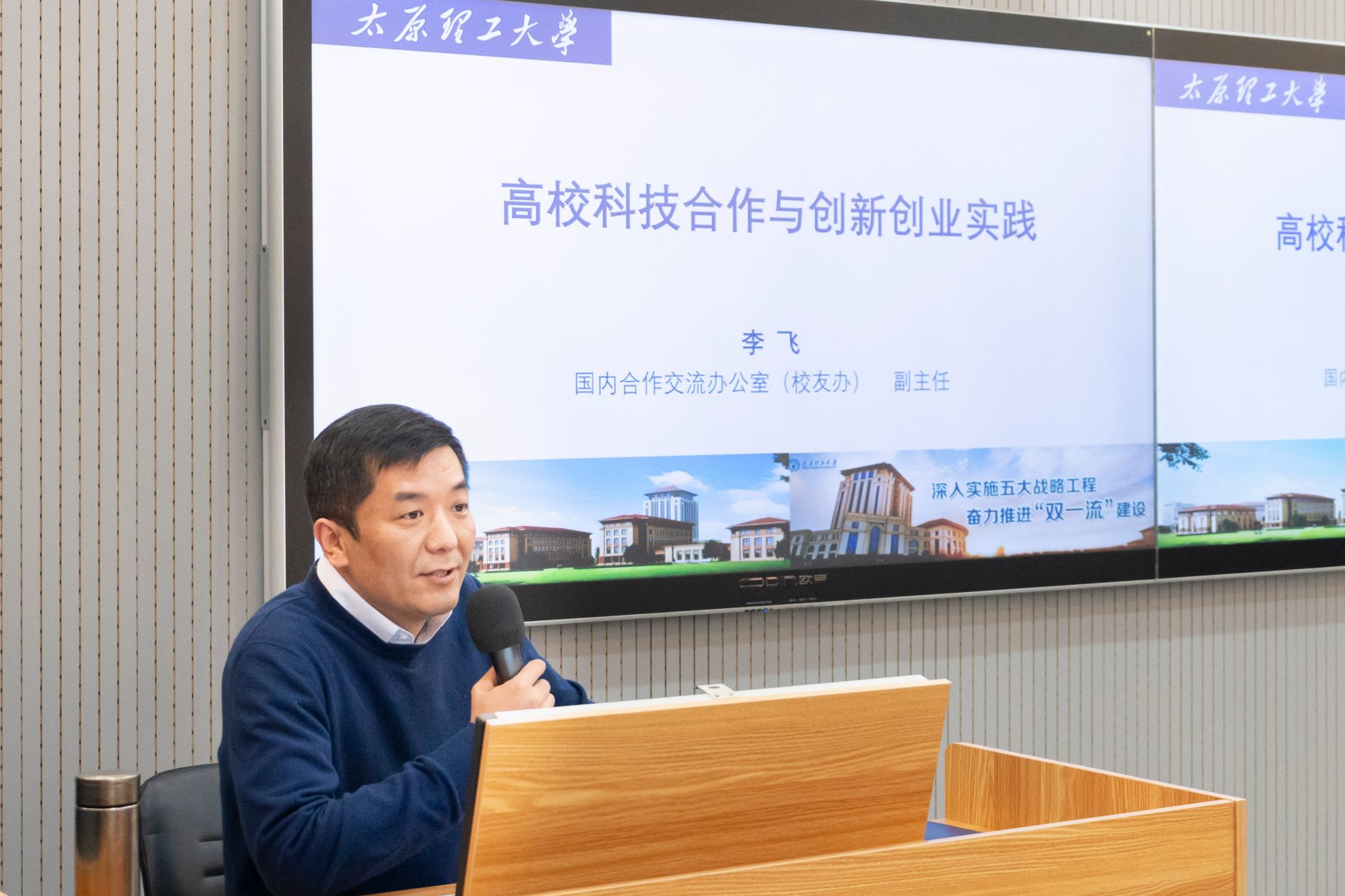 本次讲座以“高校科技合作与创新创业实践”为主题,邀请太原理工大学国内交流合作办公室副主任、工学博士李飞主讲。李飞以自身的科研经历为例,结合bat365的学科特点及专业特色,从高校科技合作的目的出发,和大家分享了合作的途径和方法,讲解了科技成果转化案例,着重阐述了学校有组织科研的重要性。