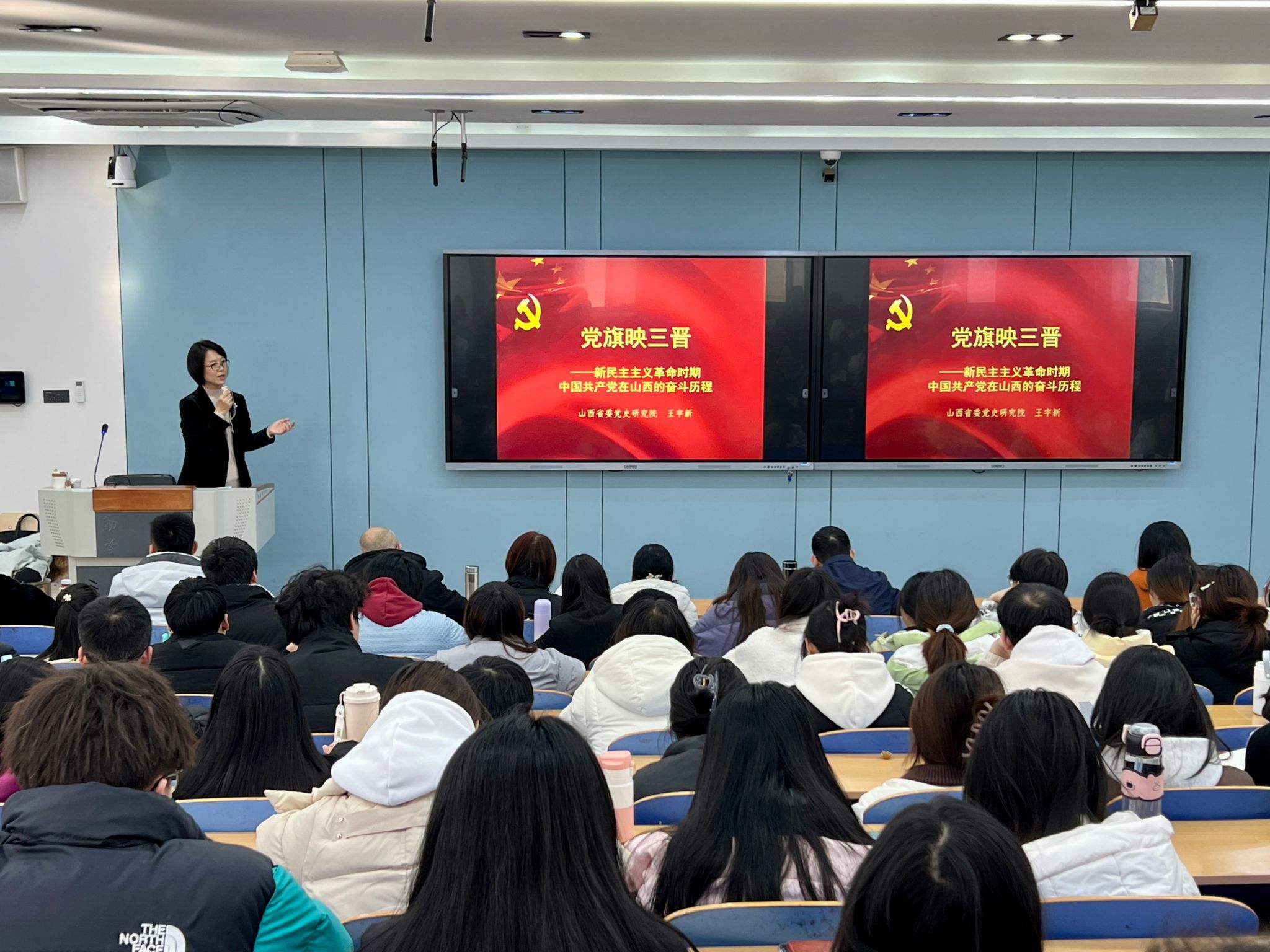 本次活动特邀中共山西省委党史研究院党史研究四室副主任王宇新开展宣讲。王宇新以《党旗映三晋——新民主主义革命时期中国共产党在山西的奋斗历程》为题,详细梳理了中共山西党组织的建立过程,通过生动的图片影像资料,深刻阐释了历史主动精神的丰富内涵,带领大家共同追寻三晋大地上的红色记忆,号召新时代青年要从深厚博大的共产党人精神谱系中不断汲取前行力量,坚定理想信念,自觉崇尚英雄,弘扬红色精神,接续砥砺奋斗,努力成为担当民族复兴大任的时代新人。