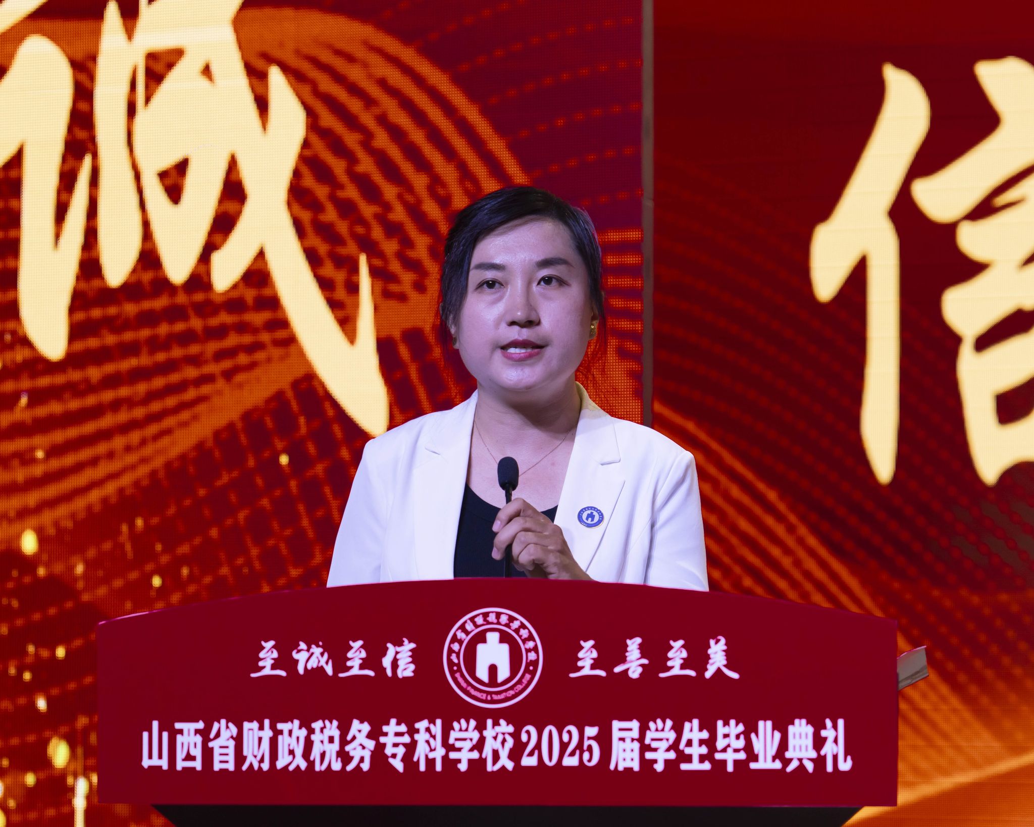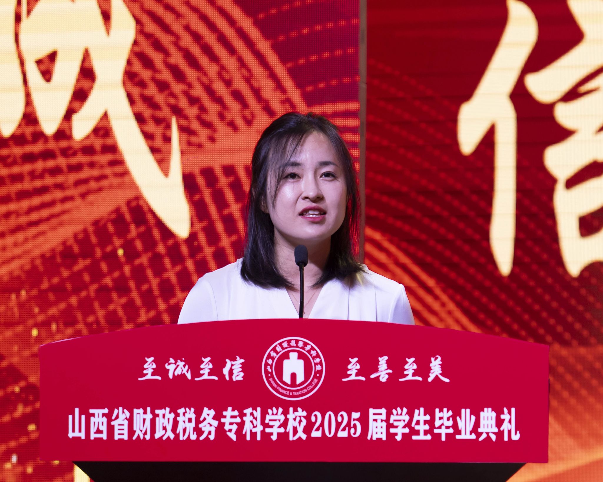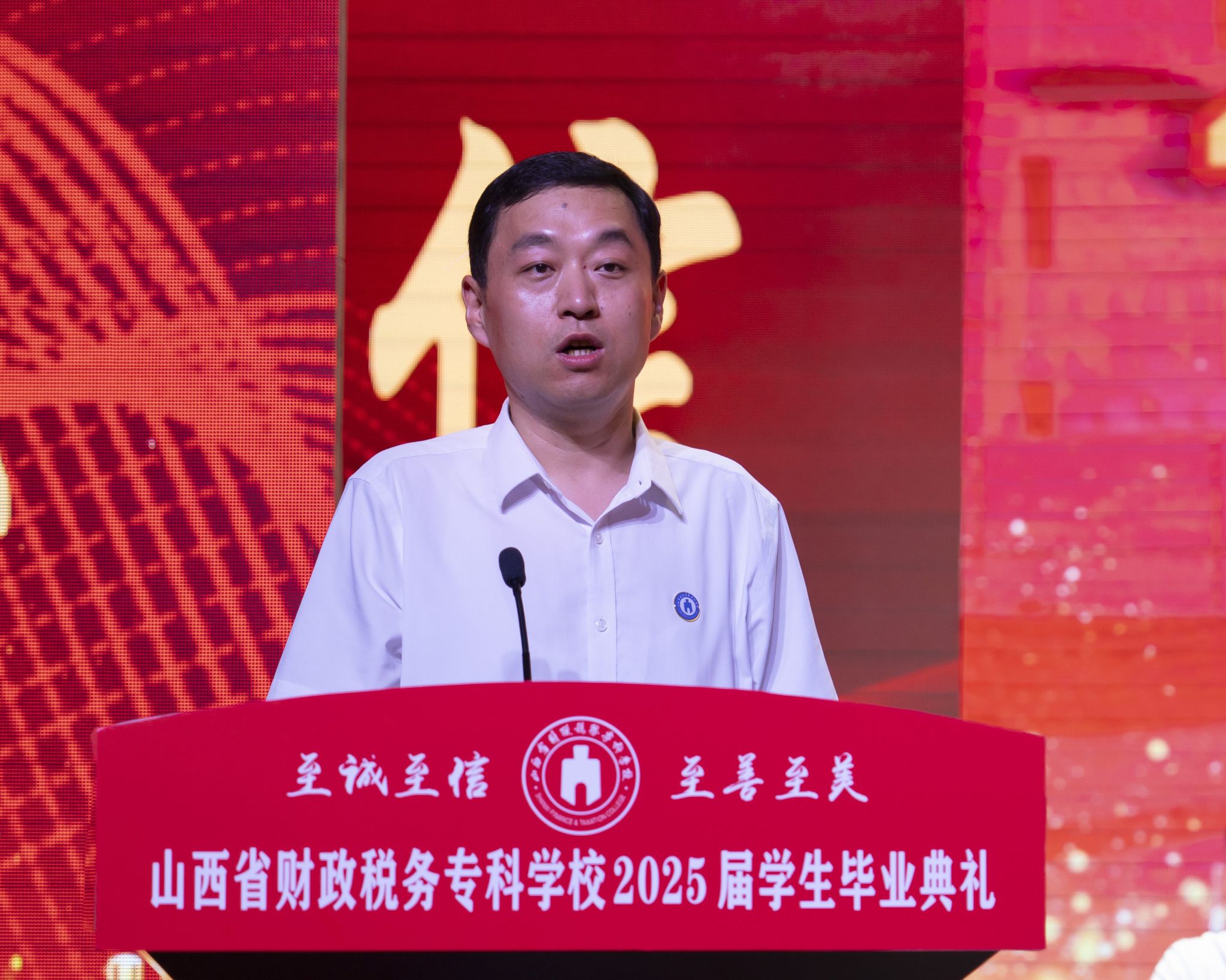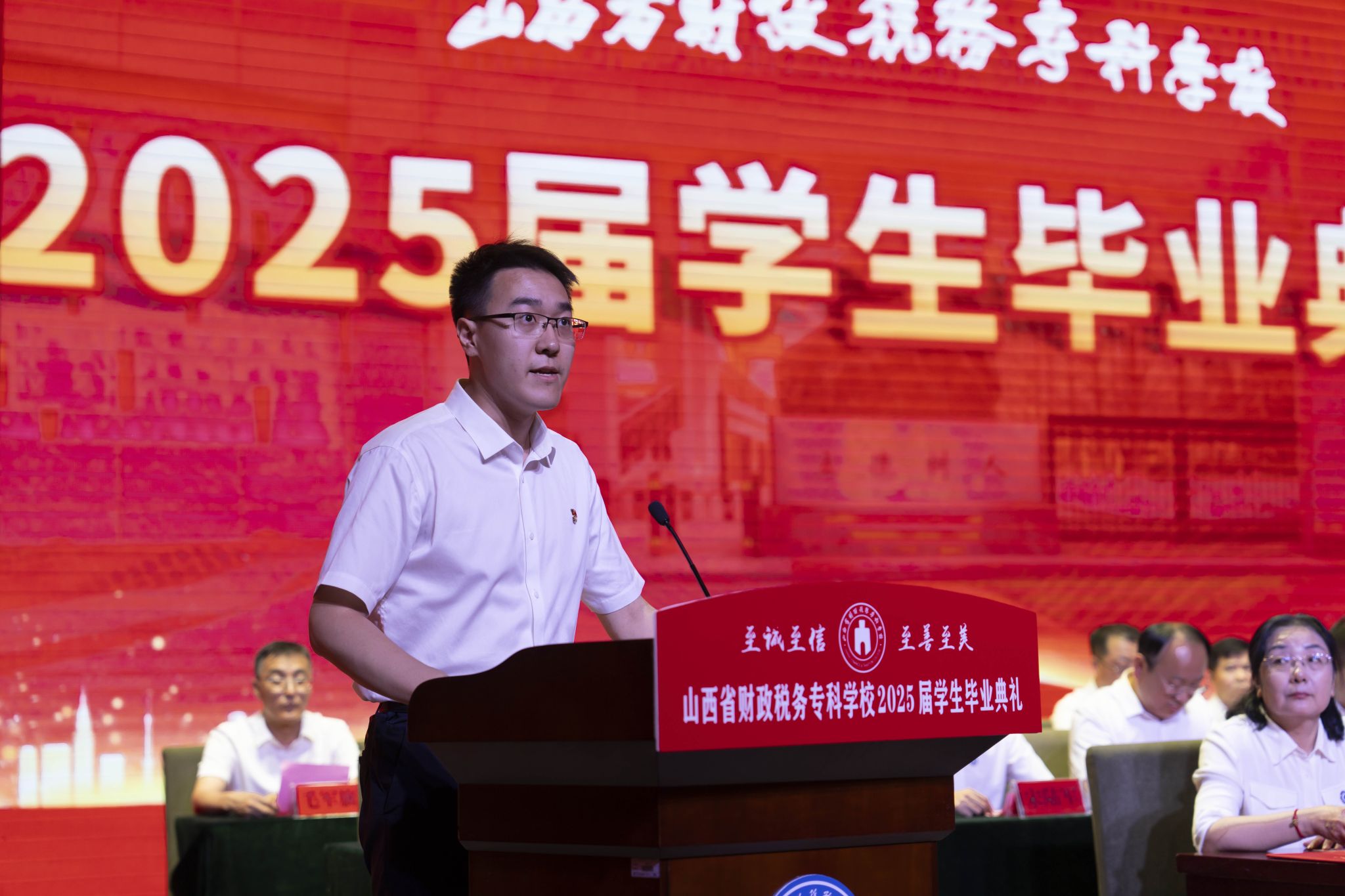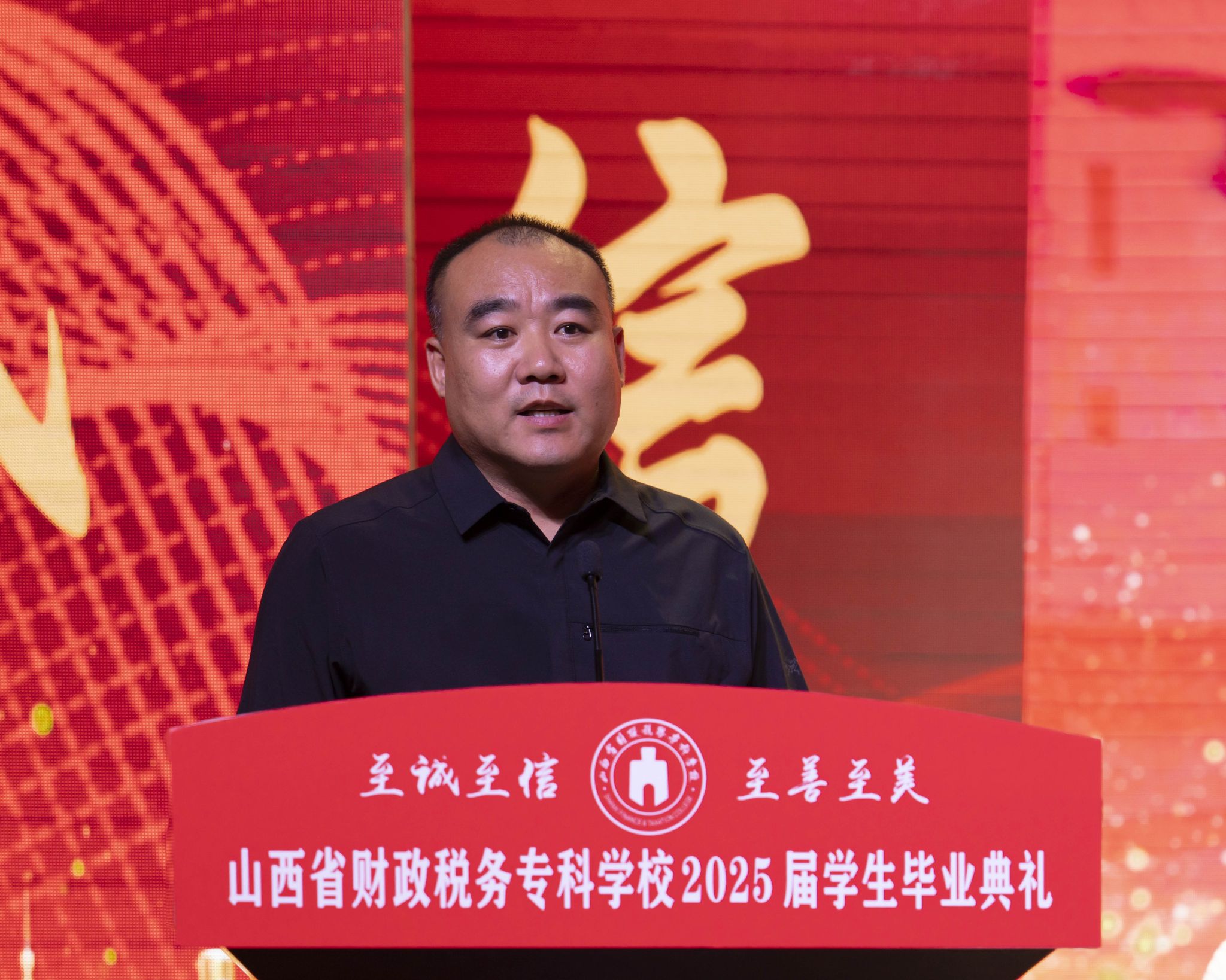 李赟鹏以《与梦同行,用爱照亮美好未来》为题,寄语毕业生用接纳与好奇善待自己,以陪伴与理解反哺家人,凭恪尽职守热爱工作,借岗位建功回馈国家,号召学子将“至诚至信、至善至美”的校训融入新时代新征程,在海阔天空中以爱为炬,照亮属于财专人的青春山海。