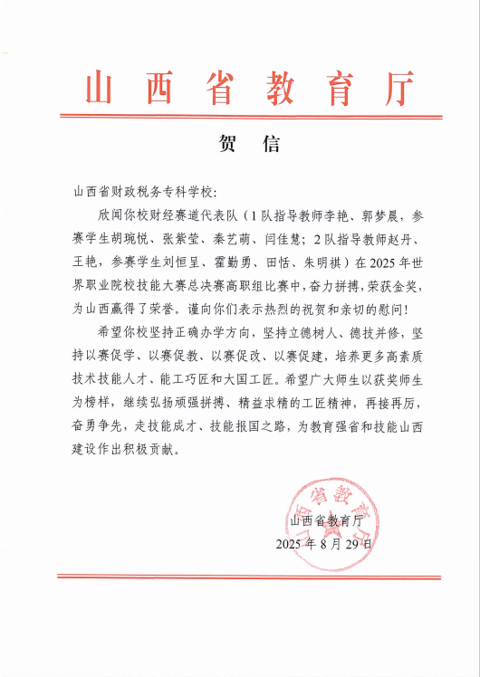 近日,山西省教育厅向bat365发来贺信,热烈祝贺bat365两支参赛队在2025年世界职业院校技能大赛总决赛争夺赛财经赛道高职组赛事中齐获金奖。
