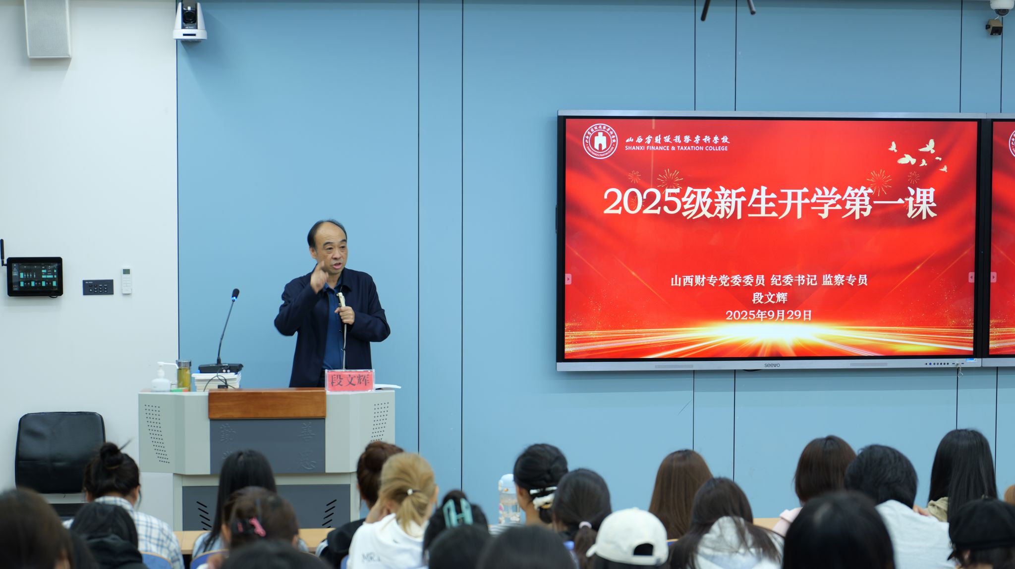 9月29日上午,党委委员、纪委书记、监察专员段文辉在J307教室为文化旅游学院2025级新生讲授“开学第一课”。