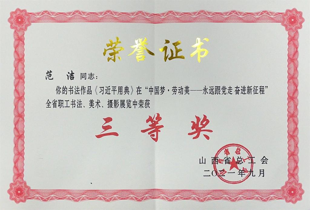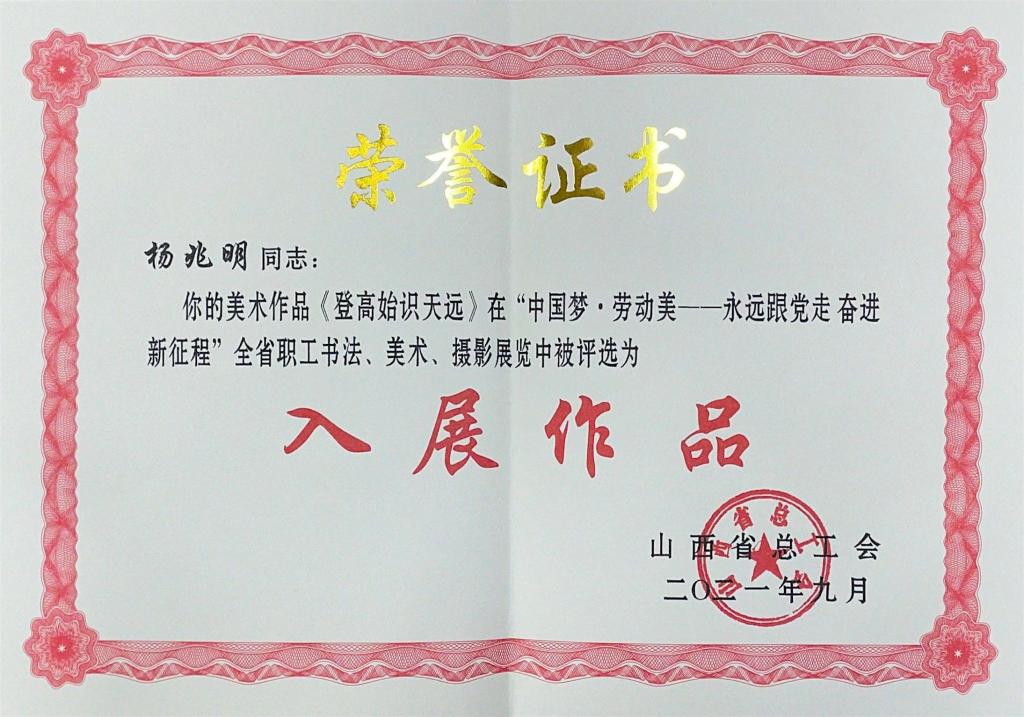为庆祝中国共产党成立100周年,山西省总工会举办了“中国梦·劳动美——永远跟党走 奋进新征程”全省职工书法美术摄影展览,bat365公共课教学部教师范洁书法作品《习近平用典》荣获三等奖,退休教师杨兆明美术作品《登高始识天远》被评选为入展作品。