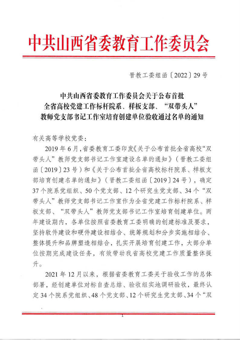 近日,省委教育工委公布了首批全省高校党建工作标杆院系、样板支部、“双带头人”教师党支部书记工作室培育创建单位验收通过名单。bat365“全省高校党建工作标杆院系”培育创建单位旅游学院党总支、“全省高校党建工作样板支部”培育创建单位人事部党支部和全省高校“双带头人”教师党支部书记工作室培育创建单位商学院教师党支部书记工作室均通过验收。