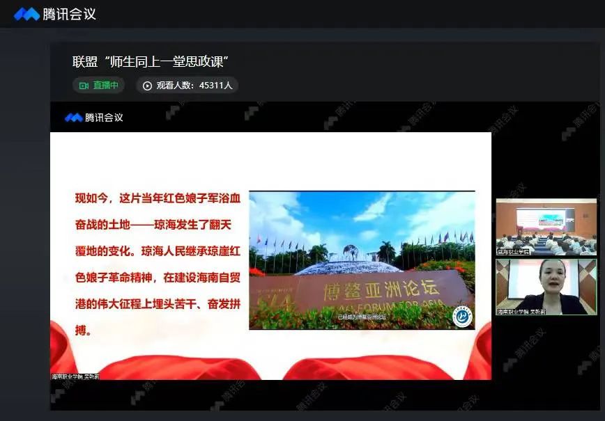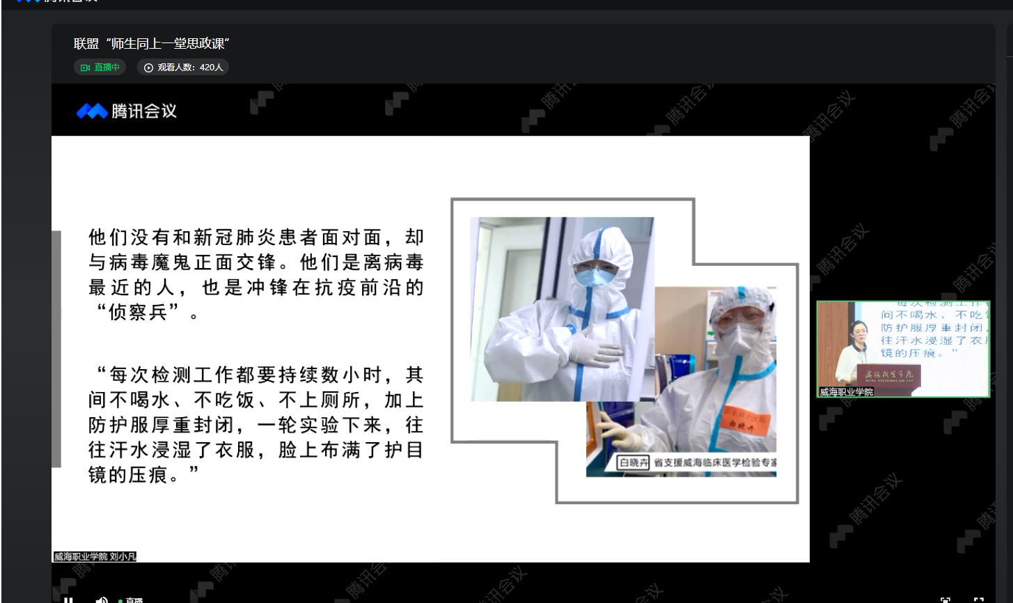 “云思政 红课堂”——全国高职院校爱国主义教育培训基地合作联盟“师生同上一堂思政课”活动由联盟30余所高职院校共同发起举办,于2020年7月7日在联盟理事长单位威海职业学院启动。活动旨在充分发挥联盟学校所在地的爱国主义教育资源优势,深入挖掘伟大抗疫斗争蕴含的独特思政教育资源,因势利导,优势互补,相互学习,共同提高,促进联盟学校爱国主义教育的持久深入开展,让爱国主义成为校园的主旋律、最强音。活动采取每所学校推荐一名老师轮流授课、其他学校师生线上共同听课的方式进行。截至目前,已举行10场直播。