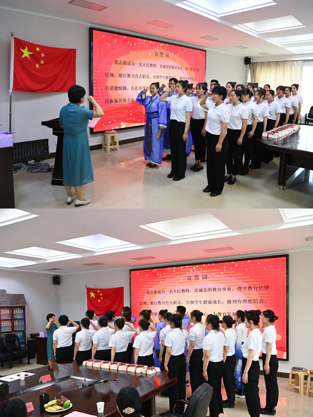 在鲜艳的红旗下,全体新入职教师右拳紧握、许下了自己为党育才为国育人的铮铮誓言。