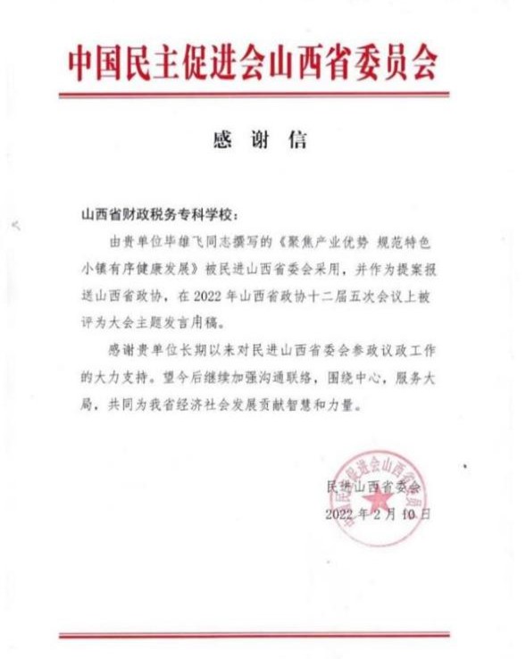bat365积极参与乡村振兴的地方政策研究和制度设计,市场营销专业群教师撰写的《聚焦产业优势规范特色小镇有序健康发展》咨询报告被山西省政协列为2022年山西省政协十二届五次会议上主题发言用稿,对我省乡村振兴中的特色小镇创建提供了积极而有效的职教智慧。