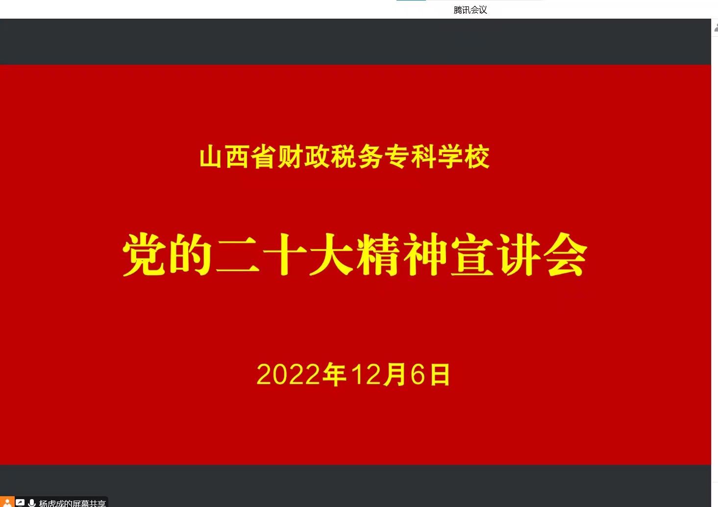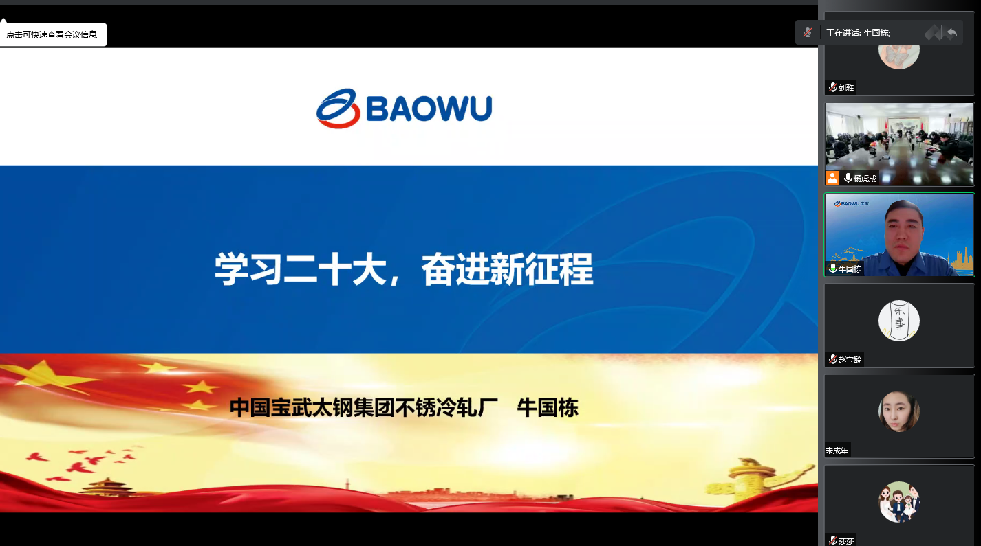 学习宣传贯彻党的二十大精神,是当前和今后一个时期学校的首要政治任务。为推动bat365学习党的二十大精神走深走实,学出成效,12月6日下午,学校邀请党的二十大代表、宝武太钢集团不锈冷轧厂连轧作业区班长牛国栋和山西省委党校党建教研部副主任、副教授陈彪两位专家,在线进行党的二十大精神宣讲。全体党员领导干部、教职员工和学生代表通过视频会议形式参加学习。党委副书记杨晓明主持宣讲会。