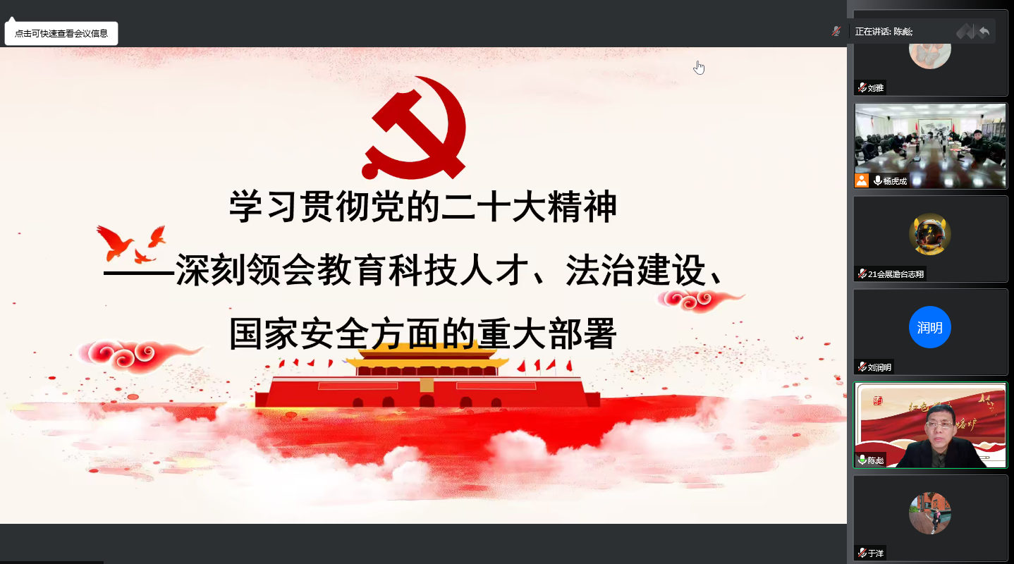 陈彪老师以《学习贯彻党的二十大精神——深刻领会教育科技人才、法治建设、国家安全方面的重大部署》为题,紧扣党的二十大主题娓娓道来,方向明确、重点突出、逻辑严谨,既有理论阐释和案例剖析,又有政治高度和实践深度,既是一次宣讲辅导,又是一堂生动精彩的党课,加深了bat365师生对党的二十大在教育科技人才、法治建设、国家安全方面重大部署的领会和认同,对我们准确把握党的二十大精神提供了很好的帮助。