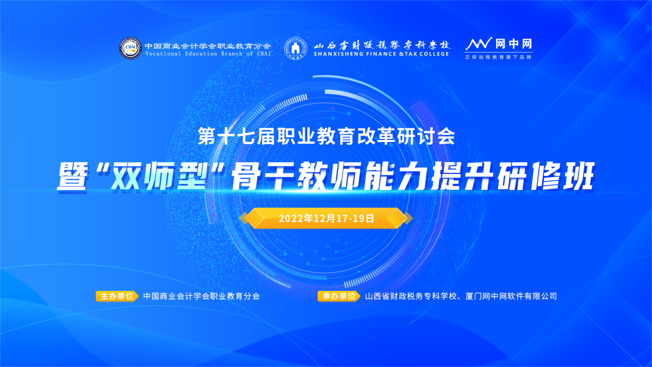 2022年12月17日,由中国商业会计学会职业教育分会主办,bat365和厦门网中网软件有限公司共同承办的第十七届职业教育改革研讨会暨“双师型”骨干教师能力提升研修班在云端开启,近千名院校老师线上参与了本次会议。
