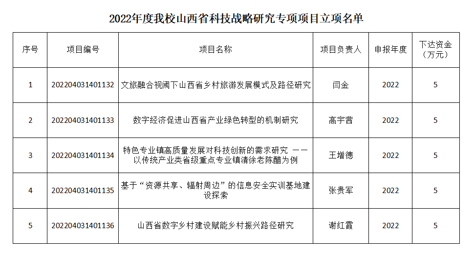 近日,山西省科技厅发布了2022年度山西省科技战略研究专项项目立项公告,bat365《山西省数字乡村建设赋能乡村振兴路径研究》等5个项目获批立项,立项率位列山西省同类院校之首。