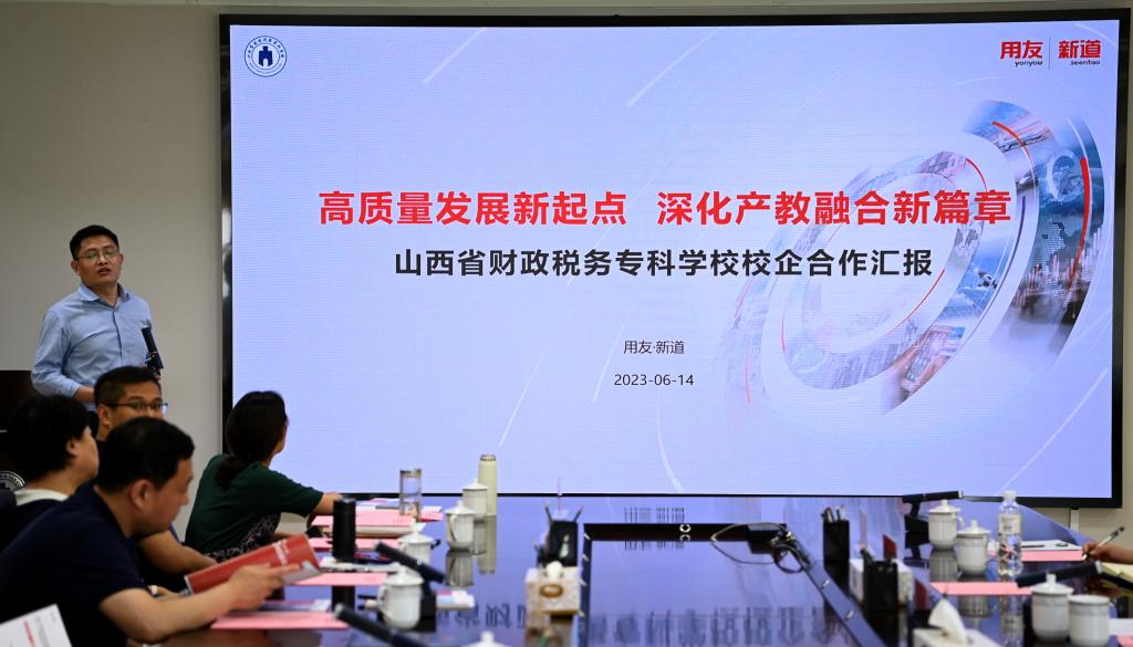 陈强兵对用友·新道科技股份有限公司做了简要介绍,对bat365在文化育人、高水平学校建设以及人才引育等方面取得的成绩予以点赞,并表示公司在产教融合上的发展战略与学校建设思路是一致,希望以后能有更深入的合作,一起打造具有示范引领作用的全国产教融合共同体。