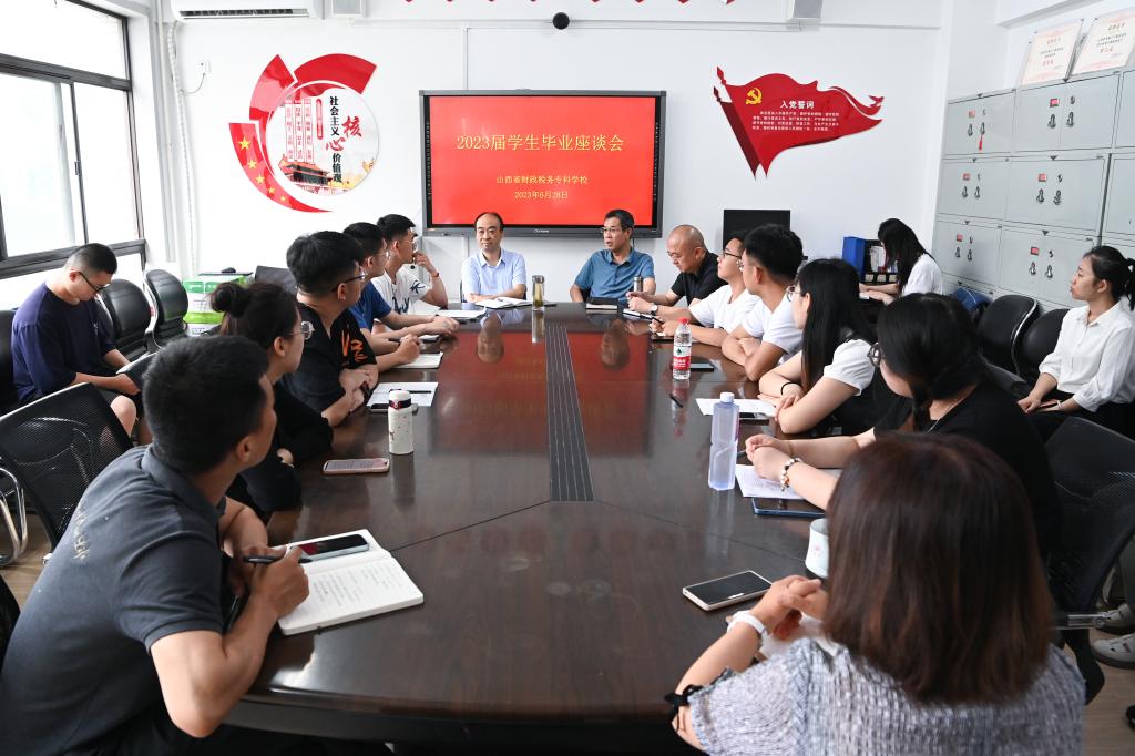 6月28日上午,学校在第五会议室、二楼小会议室、商学院会议室同时召开2023届学生毕业座谈会。党委书记秦华伟,党委副书记、校长李赟鹏,党委副书记杨晓明,党委委员、纪委书记段文辉,党委委员、副校长冯东元,党委委员、副校长郭艳萍,以及各学院党总支书记、相关部门负责人、辅导员和毕业生代表分别参加了座谈会。