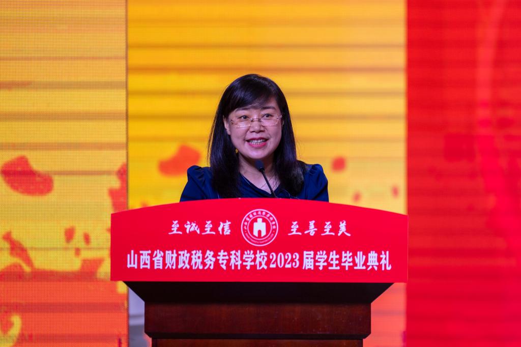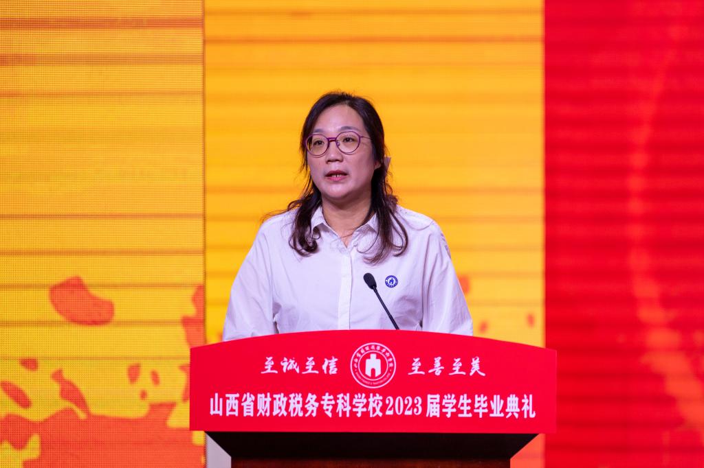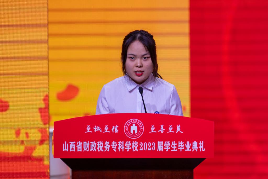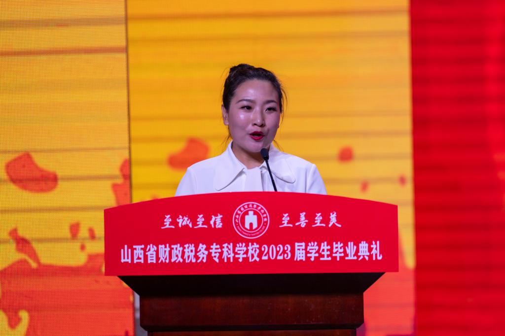 信息科技学院高燕飞老师、文化旅游学院马瑞老师分别代表全体教师和辅导员为毕业生送上美好祝愿。校友代表高朝霞结合自己的成长经历,勉励同学们要始终保持终身学习的能力,学会感恩、积极、乐观、向上、向善。信息科技学院2020级软件技术班韩玉莹代表全体毕业生表达了对母校的感恩之情。