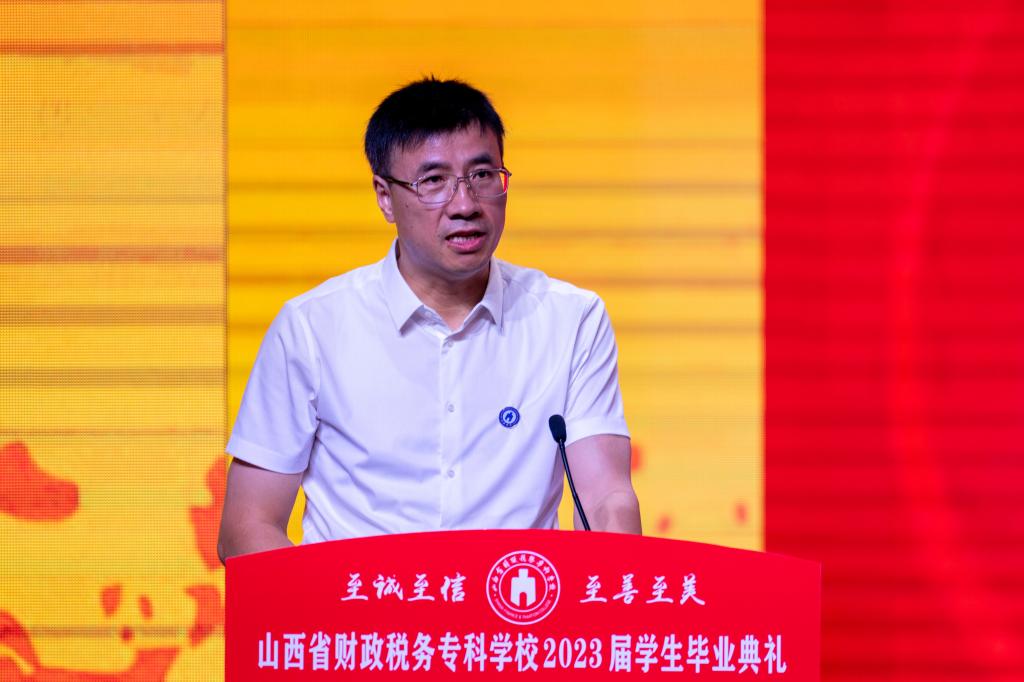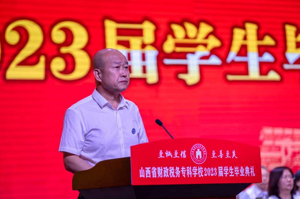 党委书记秦华伟以“青春逢盛世奋斗正当时”为题作了讲话。他代表学校向顺利完成学业的全体毕业生表示由衷的祝贺,向悉心培养大家的老师和家长表示衷心的感谢。他指出,三年来大家同学校命运与共、携手共进,学校内涵式发展取得了突破性成绩。每一位毕业生都是历史的亲历者、见证者,更是历史的创造者,正是这一段段青春经历,讲述了动人的财专故事,丰富了学校深厚内涵,传承了宝贵的财专精神。