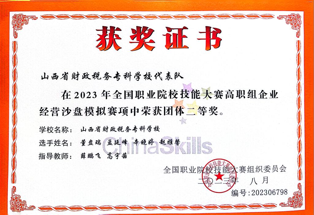 8月17日,2023年全国职业院校技能大赛(高职组)企业经营沙盘模拟赛项在河北石家庄圆满落幕,来自全国各地的83所院校参加了此次比赛。经过一天的激烈比拼,bat365会计学院薛鹏飞和高宇茜老师指导的董盎瑞、孟廷峰、辛晓婷、赵雅馨参赛团队,以全国第13名的成绩荣获国赛二等奖。