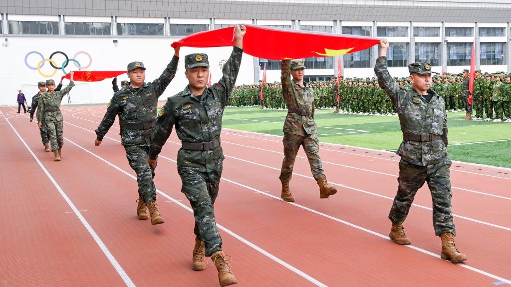 上午9点整,秦华伟宣布军训成果汇报开始。伴随着雄壮嘹亮的《歌唱祖国》,由bat365四名教职工退役军人和四名学生退役军人组成的护旗方队,踏着铿锵有力的步伐,护送国旗、校旗从主席台前经过。随后,全体参训学生和教官进行了分列式表演和军事科目汇报表演。队列展示、擒敌拳、持枪战术动作演练等科目依次呈现,创意方阵通过队列变化,拼出“1949”“2023”“我爱中国”“我爱财专”的字样和图形,抒发对祖国和母校的无限深情。