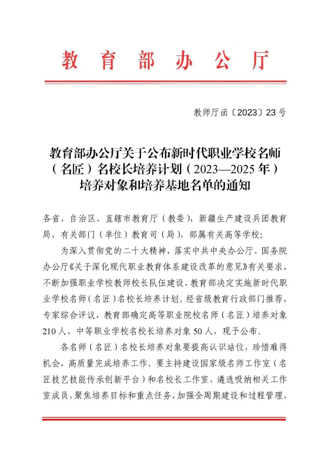 据悉,教育部新时代职业学校名师(名匠)名校长培养计划(以下简称职教“三名”计划)旨在培养打造一批理想信念坚定、师德高尚、教育教学能力和专业实践能力突出的双师型名师(名匠),一批办学理念先进、办学定位准确、勇于开拓创新、精通现代职业学校治理的教育家型名校长。职教“三名”计划注重团队建设、示范引领,要求名师(名匠)名校长培养对象主持建设国家级名师(名匠)工作室和名校长工作室,遴选吸纳工作室成员,在专业发展、岗位聘用等方面予以倾斜,聚焦培养目标和重点任务,加强全周期建设和过程管理,形成高水平建设成果,发挥示范引领和辐射带动作用。