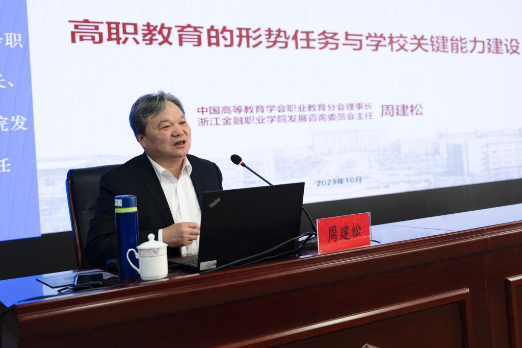 周建松教授围绕党中央国务院对高职教育的关心重视、全社会对高职教育的期待、高职教育面临的挑战,用三个“前所未有”概括了当前高职教育面临的形势;从聚焦高质量发展主题、唱响党的领导和思想政治教育强音、深化现代职业教育体系建设、推动数字化改革行动和项目任务建设、关注双高计划、把握职业教育本科走势和进程等七个方面指出了高职教育面临的繁重艰巨任务;就如何加强学校自身建设,提出了建好以习近平新时代中国特色社会主义思想为指导的党建思政工作体系、五育并举的立德树人体系、党建统领的内部治理体系、校政行企的外部合作体系、关键能力为基点的质保体系、校园和谐师生幸福的文化体系、学校高质量发展和创先争优工作体系等七条路径。周建松还重点从党的领导力、教学内涵力、队伍战斗力、服务贡献力、文化引领力、资源整合力六个方面阐释了全面提升关键办学能力的着力点,分享了抓好关键内涵建设指标的理论和实践经验。