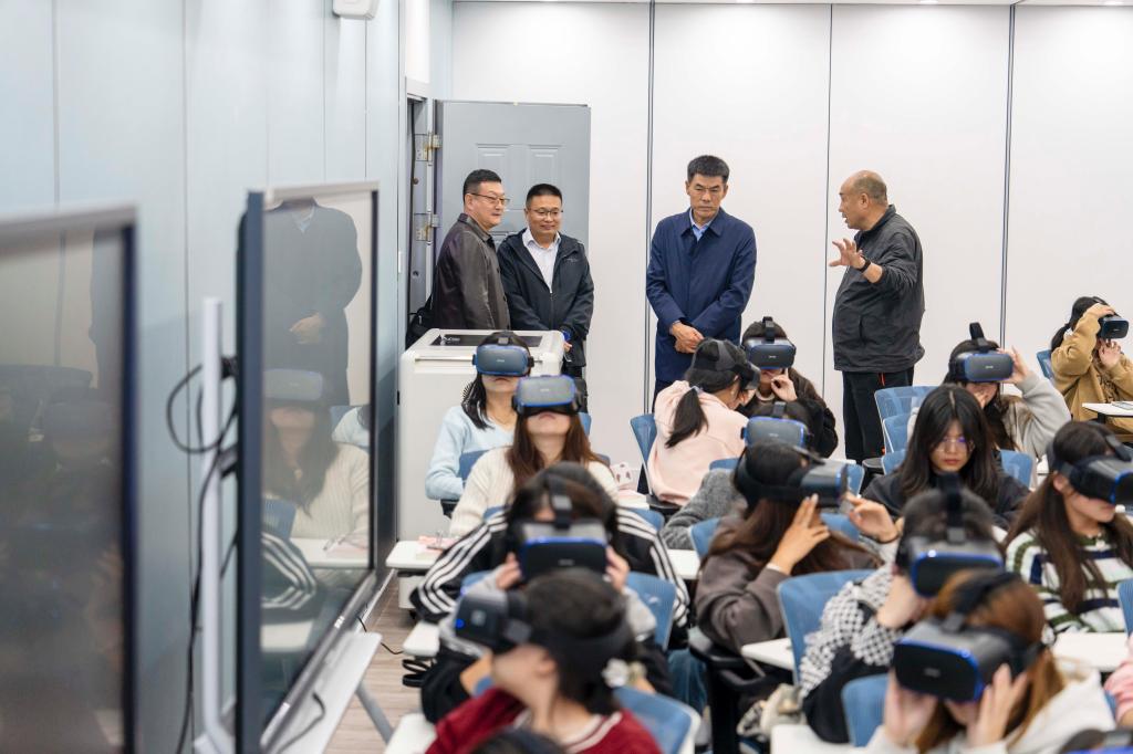 梁军一行详细了解了bat365的办学历史、办学特色、发展定位和办学成就,参观了会计文化示教馆、会计智能实训中心、教室集中监控与指挥中心、数字营销智慧实训中心等教学实训场所,并饶有兴致地体验微课录制、通过VR虚拟仿真设备进入太行八路军纪念馆进行参观学习。