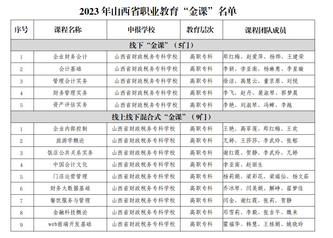 近日,山西省教育厅发布了《关于公布2023年山西省职业教育“金课”名单的通知》(晋教职成函〔2023〕87 号),经学校自主申报、形式审核、网上评审、网站公示等相关工作程序,认定首批省级职业教育“金课”239 门。本次评审,bat365共有14门课程获得认定,其中线下“金课”5门,线上线下混合式“金课”9门。