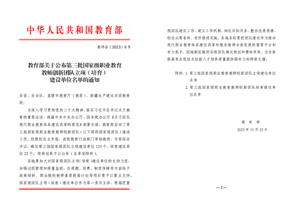 11月30日,教育部印发了《教育部关于公布第三批国家级职业教育教师创新团队立项(培育)建设单位名单的通知》文件。bat365成功入选第三批国家级职业教育教师创新团队建设单位。这是bat365深入学习贯彻习近平总书记关于教师队伍建设重要论述的生动实践,是积极实施“党建引领、多元覆盖、三级联动、协同创新”教师队伍建设模式的重大成果。