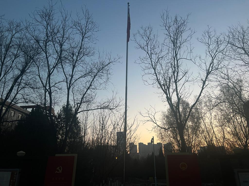 7时整,升旗仪式正式开始。英姿飒爽的国旗护卫队队员们护送着鲜艳的五星红旗进场,迈着矫健的步伐走上国旗台,行礼完毕。伴随着雄壮激昂的《义勇军进行曲》,迎着初升的太阳,鲜艳的五星红旗冉冉升起,迎风飘扬。全体学生庄严肃立,向国旗行注目礼,深怀对祖国无限的热爱和崇高的敬意。