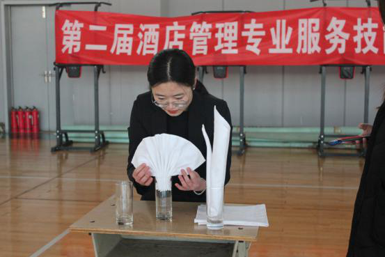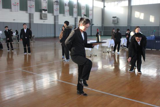 本届大赛共分为六个环节。参赛学生在“蒙眼识香”环节展现了茶艺文化中对茶叶识别的能力;在“心灵手巧”和“精雕细琢”环节展现了餐厅中口布花的折叠和客房中方巾的创意折叠;在“孔武有力”和“滴酒不漏”环节中展现了选手们扎实的托盘功底和斟酒技巧;最后的“脑洞大开”环节考察了参赛学生专业知识的储备和随机应变能力。