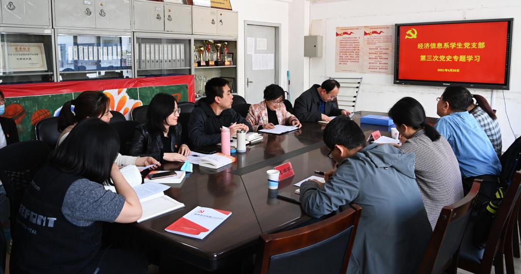 这是经济信息系党总支学生党支部开展的党史学习教育第三次专题学习。支部全体教师及在校学生党员参加了学习。党总支副书记、学生党支部书记赵云主持,省委党史学习教育巡回指导第18组副组长高专诚、成员郑淼心、张艺萱、王鸿宇莅临指导并参加学习。赵云向省委党史学习教育巡回指导组汇报了支部开展党史学习教育的基本情况。