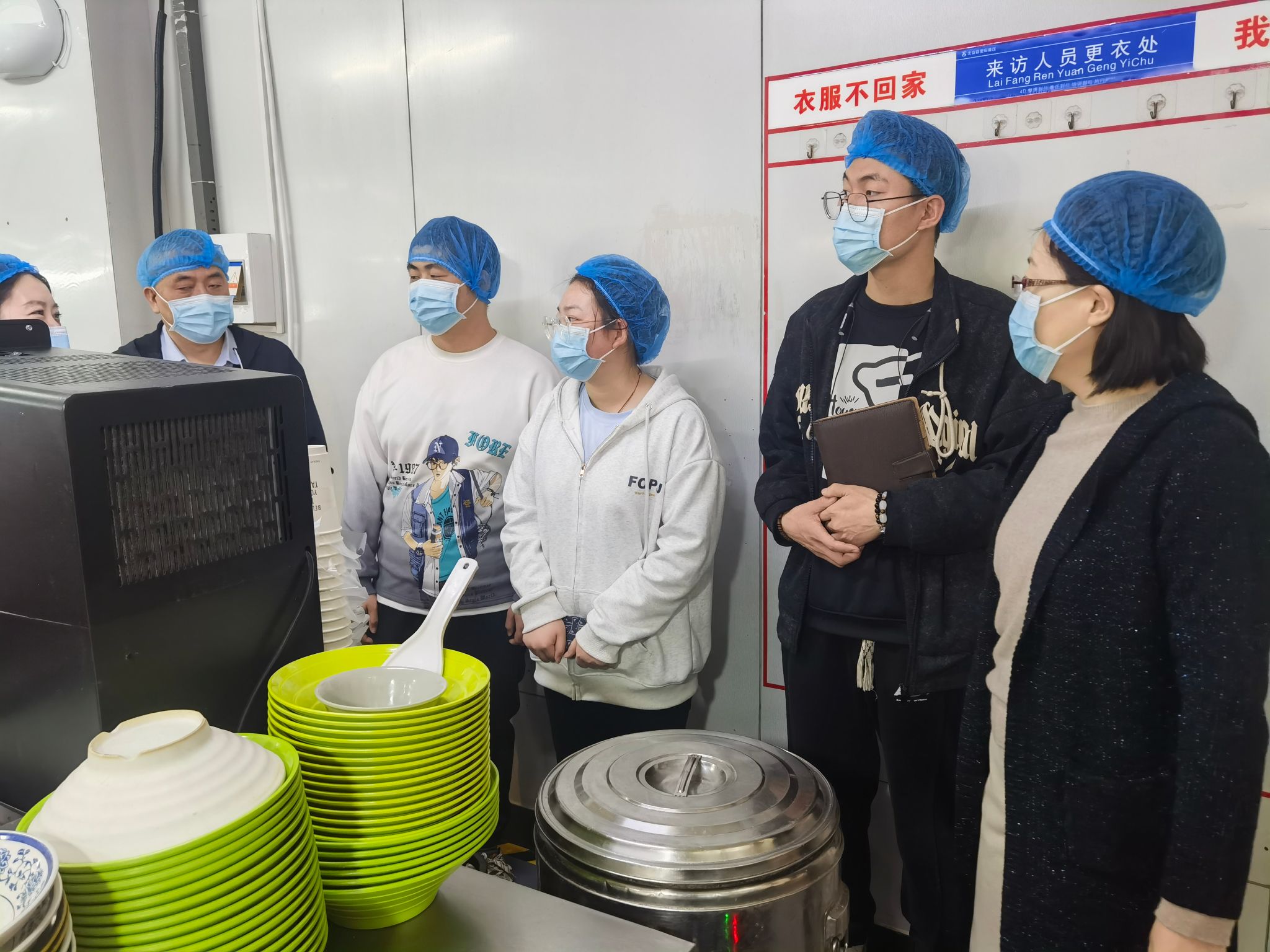 检查组从前厅到后厨,从加工间到库房,重点对原材料进货、食品留样、餐饮具洗消、从业人员健康证等方面做了详细检查。