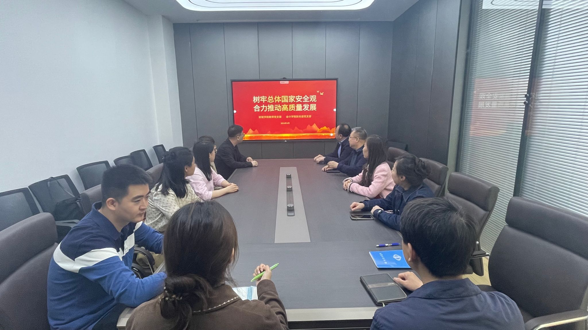 2024年是习近平总书记提出总体国家安全观的第10周年,为持续深化国家安全教育,进一步筑牢安全思想之基,增强教师党员维护国家安全的责任感和使命感,在第九个全民国家安全教育日到来之际,4月15日中午,财税学院教师党支部与会计学院财务部党支部在1号教学楼财务部会议室召开了题为“树牢总体国家安全观 合力推动高质量发展”的主题党日活动,会计学院党总支书记赵云、财务部部长段全虎、财税学院党总支书记张希和部分党员参加了此次活动。