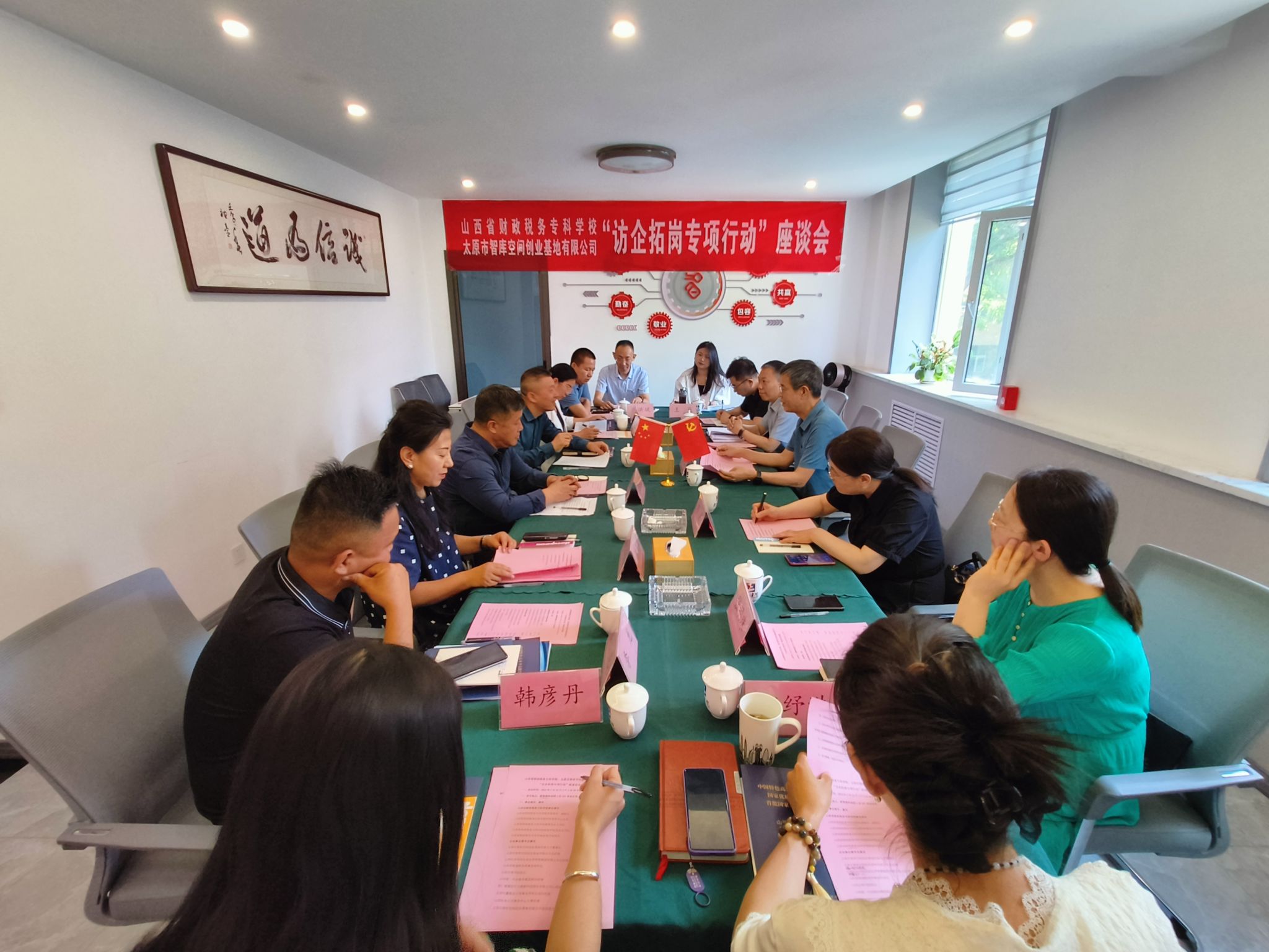 座谈会上,太原市智库空间创业基地有限公司董事长李永宏代表科创园区对bat365正版唯一官网一行的到访表示热烈欢迎。冯东元介绍了学校情况,他强调,学校高度重视学生就业工作,希望通过此次访企拓岗活动,进一步加强与企业的交流与合作。山西亿佰双创企业运营管理集团有限公司、山西晋税通税务师事务所、山西正商书院、山西第一专业服务集团、联仁健康医疗大数据科技股份有限公司、太原中鑫源会计师事务所、山西社务公共服务中心主要负责人分别介绍了各自单位的业务开展及岗位需求情况。张明珠介绍了财税学院的专业设置及人才培养状况,校企双方围绕毕业生就业工作进行了深入交流研讨,面向相关专业达成了部分就业意向。座谈会上,企业方对深入开展校企合作,拓宽合作领域表示出强烈意愿,希望双方今后加强交流,为双方的共同发展创造更多机遇,进一步实现资源共享、优势互补。