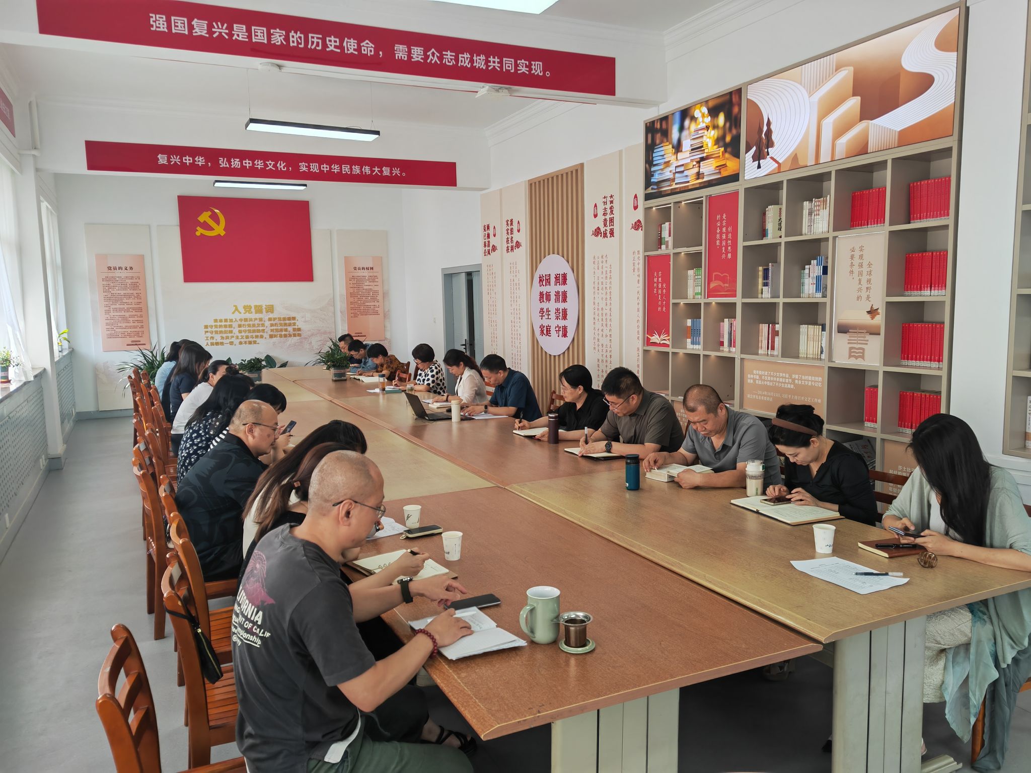 6月25日,教辅党总支在图书馆复兴书房召开理论学习中心组(扩大)集体学习会议。全体党员及入党积极分子共同参加了学习。党委委员、副校长郭艳萍出席会议。会议由党总支书记刘科伟主持。