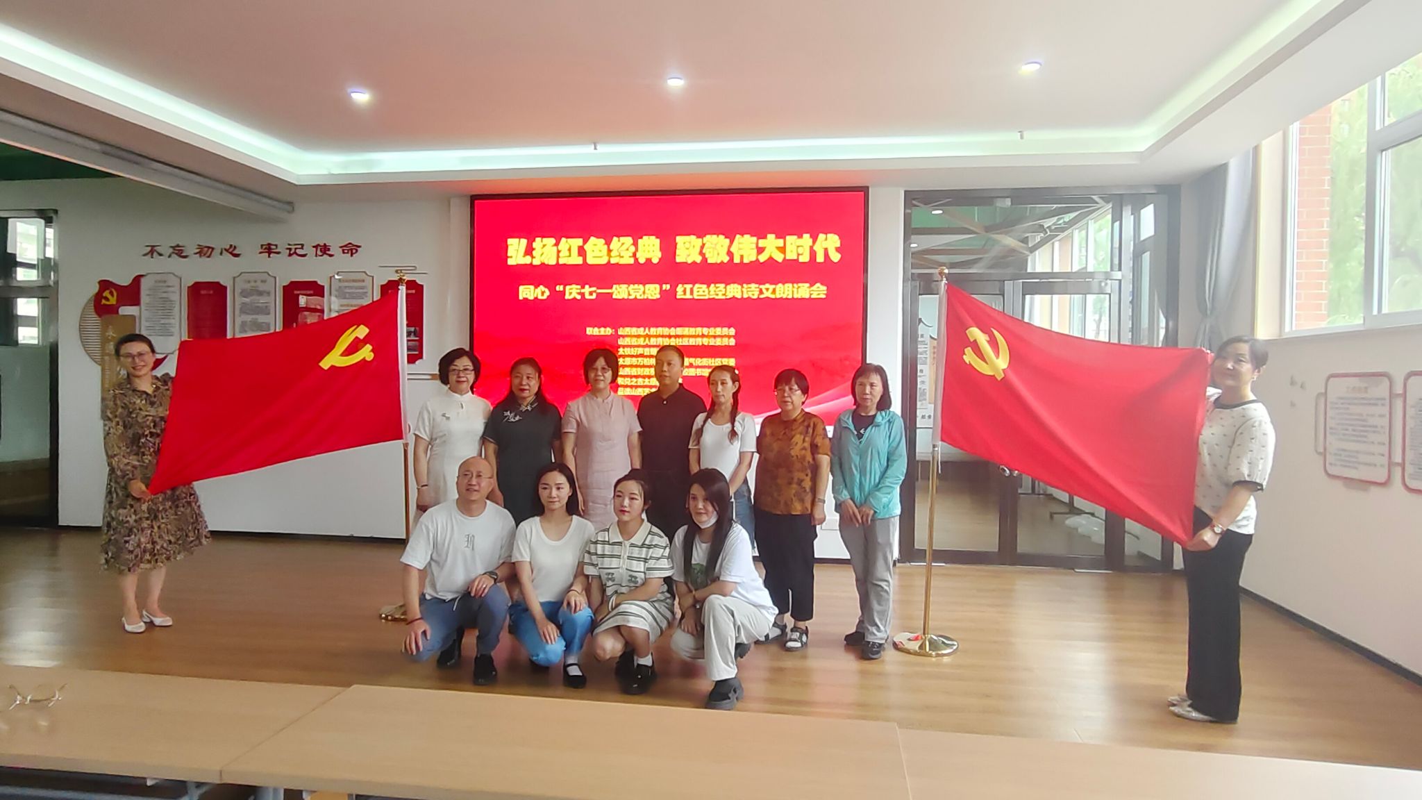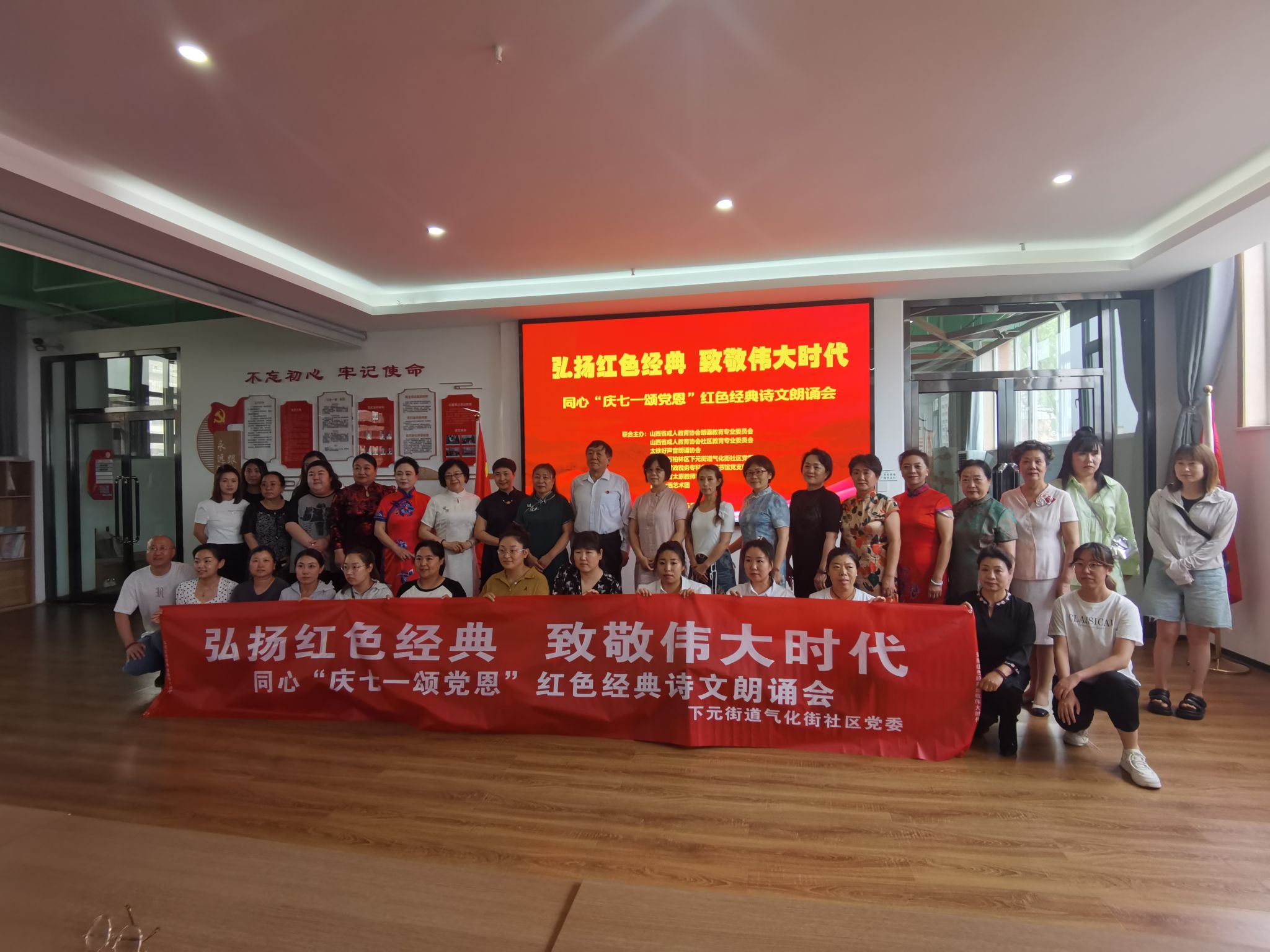 为庆祝中国共产党成立103周年,讴歌中国共产党的光辉历史和丰功伟绩,重温革命传统,赓续红色血脉,坚定理想信念,续写时代华章,6月28日,一场别开生面的“弘扬红色经典 致敬伟大时代”主题党日活动和同心“庆七一 颂党恩”红色经典诗文诵读会在下元街道气化街社区活动中心隆重举行。此次活动由bat365图书馆党支部联合下元街道气化街社区党委、山西成人教育协会、太铁好声音朗诵协会、品读山西艺术团、和兑之吉太原教师学苑等单位共同举办。bat365师生、协会和社区的工作者、朗诵协会和艺术团的艺术家们纷纷登台献艺,他们用饱含深情的朗诵、激昂的歌声和优美的舞蹈,向伟大的党献上最真挚的祝福,抒发爱党之情、报国之志。