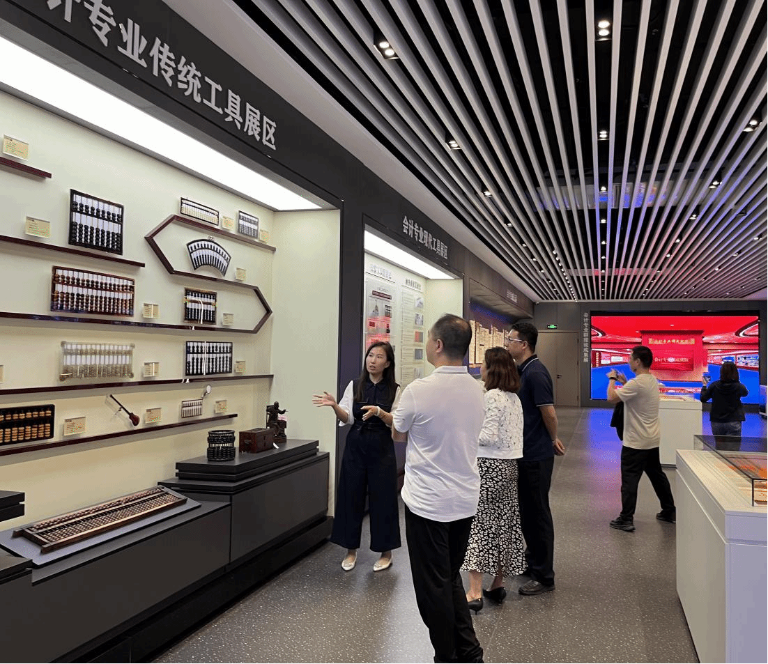 企业代表一行首先前往会计学院会计文化示教馆,由薛鹏飞介绍示教馆中陈列的各种算盘、算书等文化展品。随后,前往数智财会产教融合实践基地,由徐洁介绍基地云会计小镇、数字人技术应用等情况。参观人员感受到了学院历史文化底蕴之深厚,现代技术应用之先进,对学院的建设现状表示由衷赞赏。