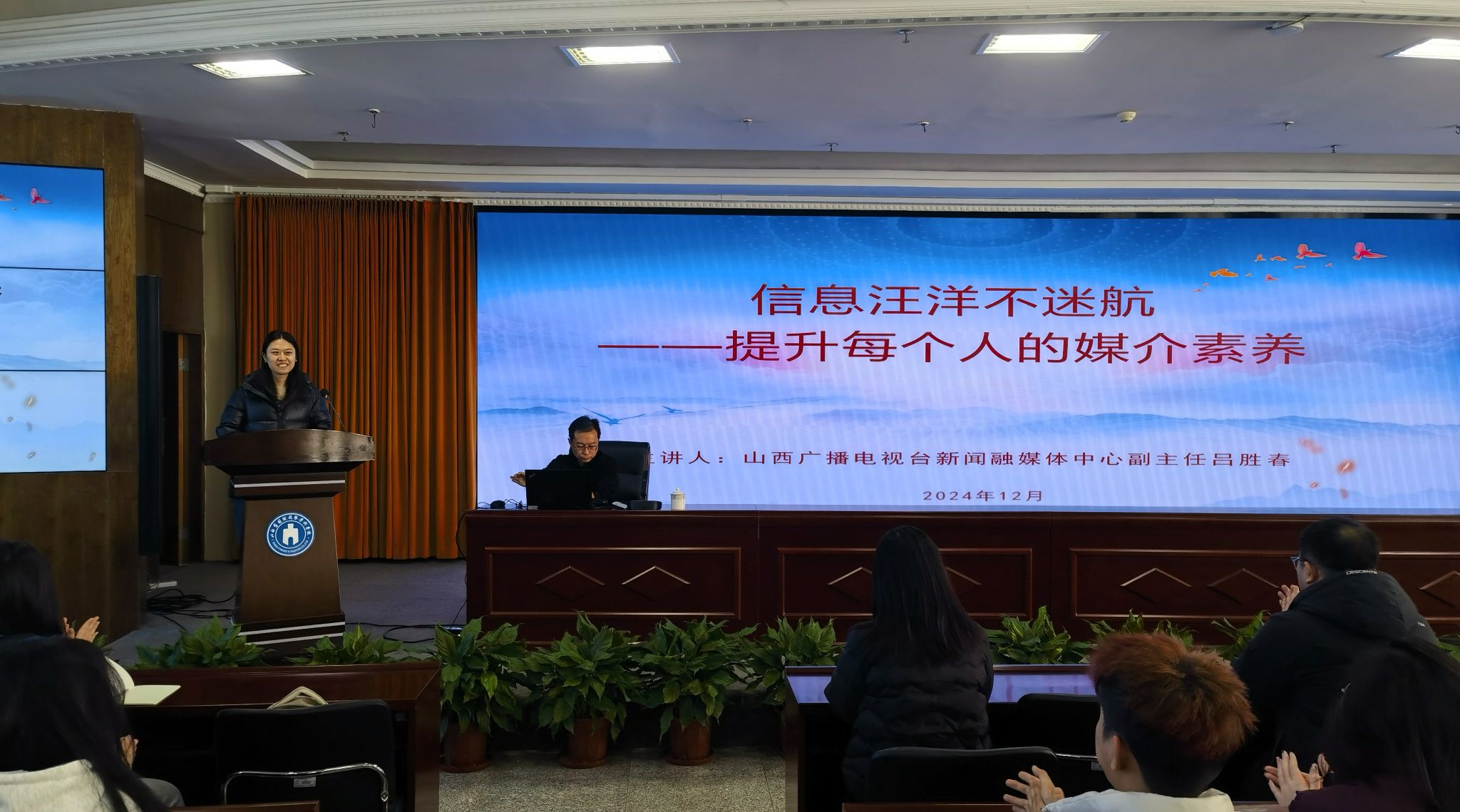 12月5日下午,文化旅游学院学生党支部与财税学院学生党支部携手合作,共同举办了一场别开生面的主题党日活动。此次活动特别邀请了山西广播电视台新闻融媒体中心副主任吕春胜,为广大师生带来了一场题为《信息汪洋不迷航——提升每个人的媒介素养》的精彩讲座。两个学院的预备党员、入党积极分子、学生代表及bat365融媒体中心学生骨干齐聚一堂,现场气氛严肃而活泼。