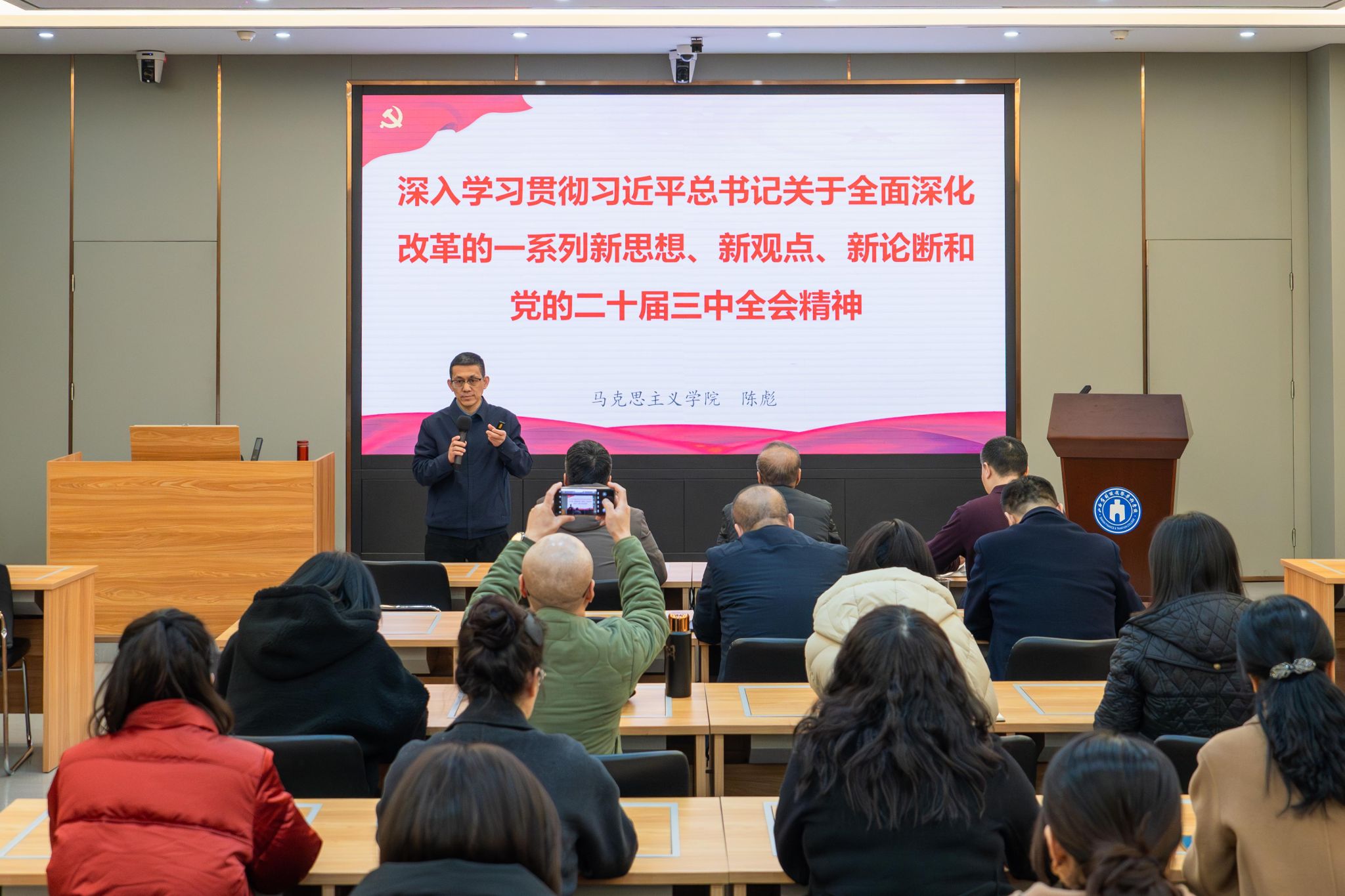 为深入学习贯彻党的二十届三中全会精神,进一步提升党员干部的政治素养和理论水平,3月5日,教辅党总支和教学党总支在1号教学楼103教室以专题讲座的形式开展了一场主题党日活动。本次活动邀请马克思主义学院负责人陈彪为主讲嘉宾,教辅党总支书记刘科伟主持活动。