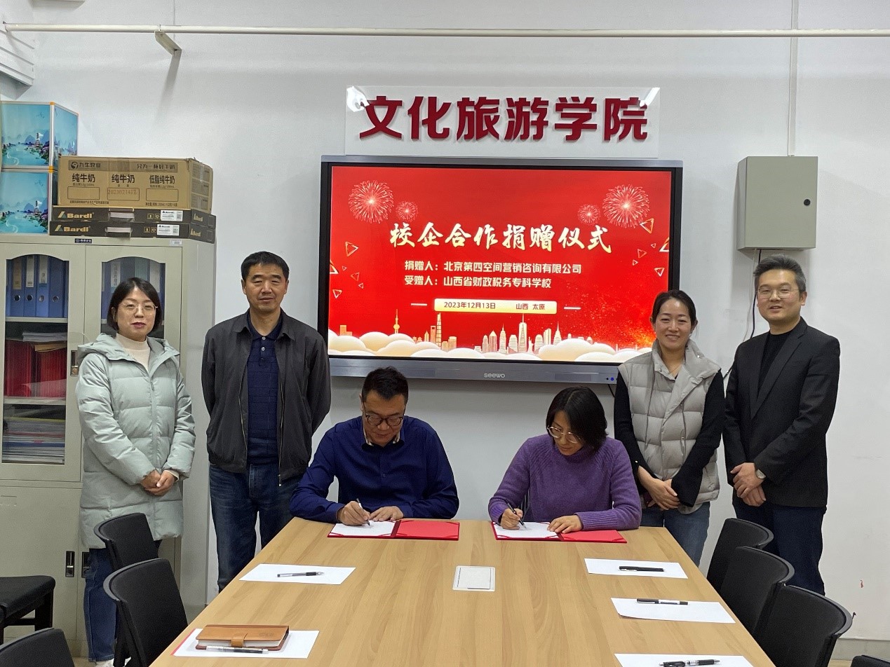 12月13日下午,北京第四空间营销咨询有限公司与文化旅游学院在320会议室举行校企合作捐赠仪式。北京第四空间营销咨询有限公司副总经理杨帆代表公司向文化旅游学院捐赠《会展项目案例教学拓展资源包—20年项目案例资源》,文化旅游学院党总支书记张卫、文化旅游学院负责人郝金连、副院长兀婷、副院长李武玲以及学校质量监测中心副主任乔一博参加捐赠仪式。