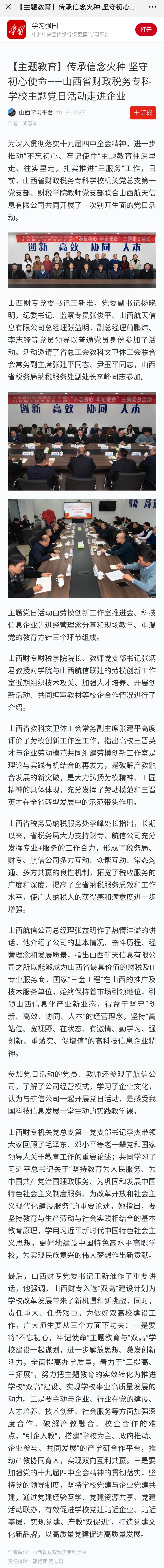 2019年12月27日学习强国平台宣传报道bat365机关党总支第一党支部、财税学院教师党支部走进山西航天信息有限公司开展党日活动。