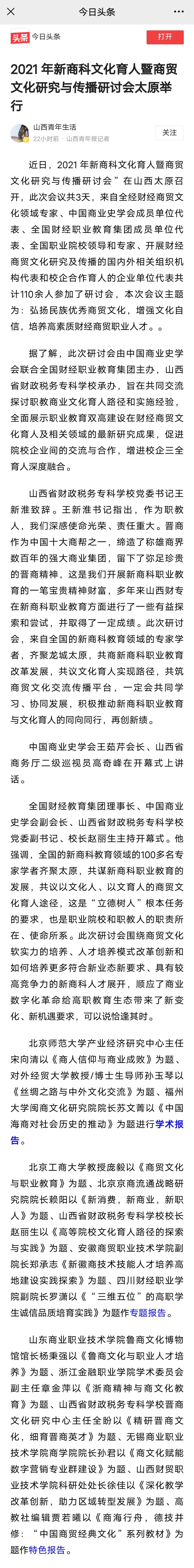 近日,2021 年新商科文化育人暨商贸文化研究与传播研讨会”在山西太原召开,此次会议共3天,来自全经财经商贸文化领域专家、中国商业史学会成员单位代表、全国财经职业教育集团成员单位代表、全国职业院校领导和专家、开展财经商贸文化研究及传播的国内外相关组织机构代表和校企合作育人的企业单位代表共计110余人参加了研讨会,本次会议主题为:弘扬民族优秀商贸文化,增强文化自信,培养高素质财经商贸职业人才。网页链接:https://www.toutiao.com/i6973951367467942432/?wid=1623830921111