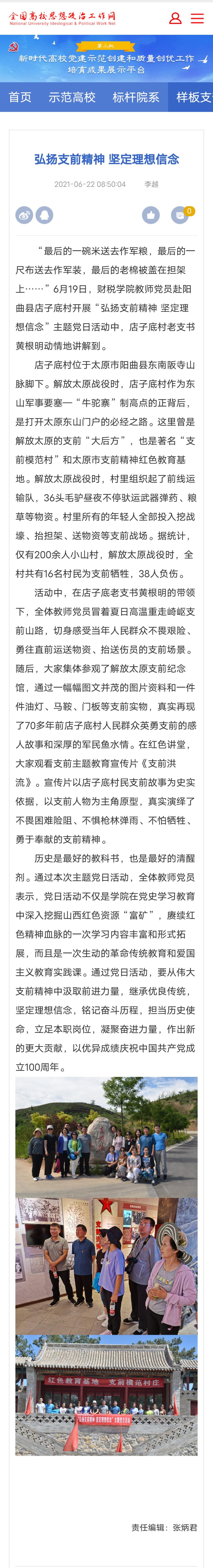 “最后的一碗米送去作军粮,最后的一尺布送去作军装,最后的老棉被盖在担架上……”6月19日,财税学院教师党员赴阳曲县店子底村开展“弘扬支前精神 坚定理想信念”主题党日活动中,店子底村老支书黄根明动情地讲解到。