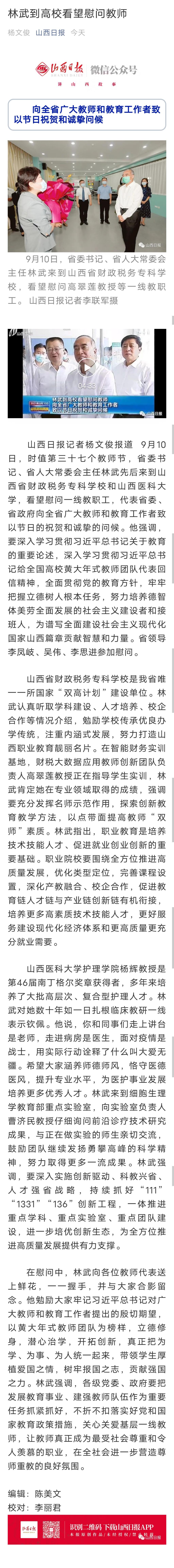 9月10日,时值第三十七个教师节,省委书记、省人大常委会主任林武先后来到bat365正版唯一官网和山西医科大学,看望慰问一线教职工,代表省委、省政府向全省广大教师和教育工作者致以节日的祝贺和诚挚的问候。他强调,要深入学习贯彻习近平总书记关于教育的重要论述,深入学习贯彻习近平总书记给全国高校黄大年式教师团队代表回信精神,全面贯彻党的教育方针,牢牢把握立德树人根本任务,努力培养德智体美劳全面发展的社会主义建设者和接班人,为谱写全面建设社会主义现代化国家山西篇章贡献智慧和力量。省领导李凤岐、吴伟、李思进参加慰问。