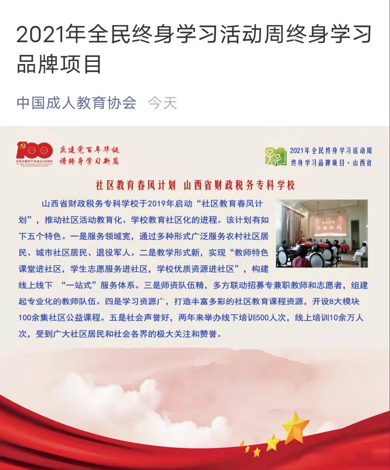 根据《教育部办公厅关于举办2021年全民终身学习活动周的通知》(教职成厅函〔2021〕20号)和教育部职业教育与成人教育司《关于征集“百姓学习之星”和“终身学习品牌项目”有关事宜的函》要求,全民终身学习活动周工作小组组织全国各省(自治区、直辖市)开展了“百姓学习之星”和“终身学习品牌项目”征集活动。bat365《社区教育春风计划》入选2021年“终身学习品牌项目”。