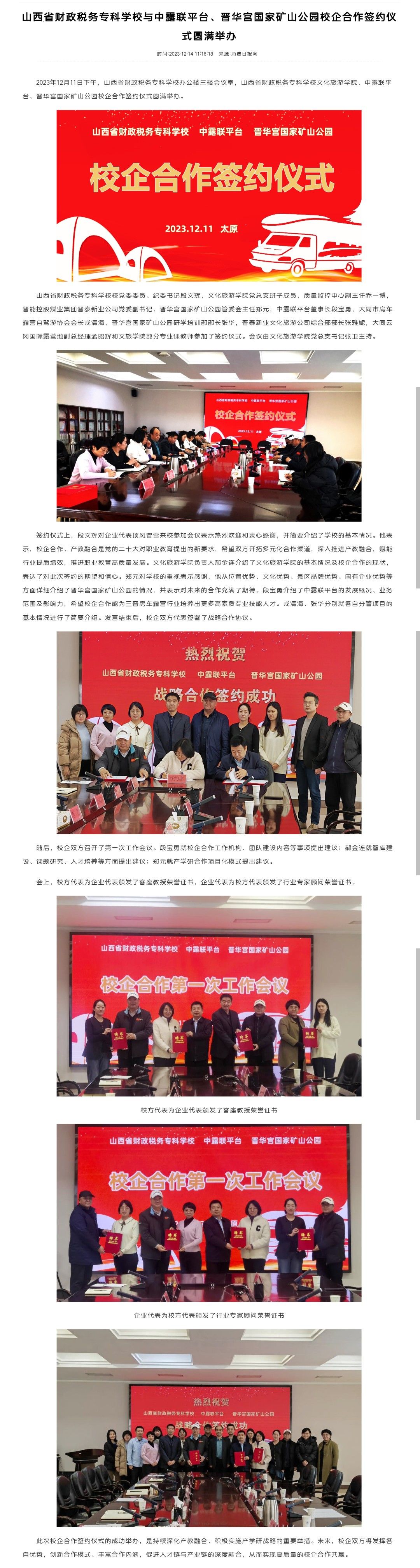 2023年12月11日下午,bat365正版唯一官网办公楼三楼会议室,bat365正版唯一官网文化旅游学院、中露联平台、晋华宫国家矿山公园校企合作签约仪式圆满举办。