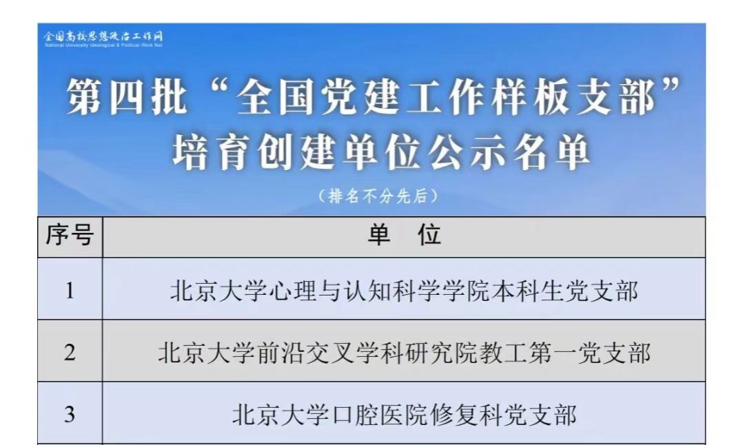 根据《教育部办公厅关于开展第四批新时代高校党建示范创建和质量创优工作的通知》(教思政厅函〔2023〕17号)安排和遴选工作方案,经省级党委教育工作部门推荐、资格审查、专家评审、教育部党的建设和全面从严治党工作领导小组成员单位集中审议,遴选产生了10个全国党建工作示范高校、100个全国党建工作标杆院系、1001个全国党建工作样板支部,现将名单予以公示(见附件)。